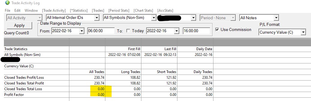 Need an assist to solve this or please point me to thread that discusses the following problem... Does anyone know why only the 2 fields (Closed Trades Profit Loss & Profit Factor) would be blank? All of the other data in the trade activity log is captured...this is the first time I have ever seen this issue, all days prior to today these 2 fields have been working correctly. -Thanks |