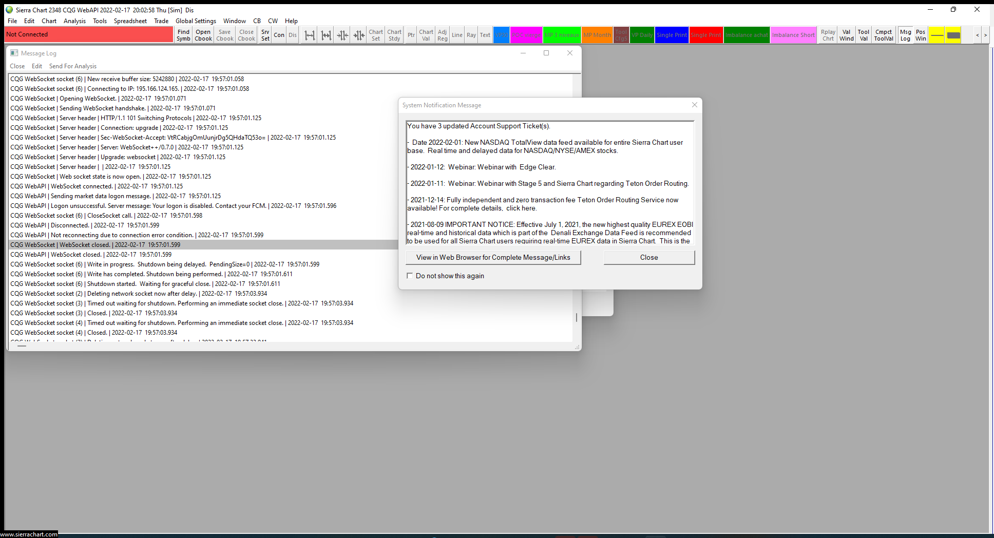 Thank you for your answer. I can succed to connect Sierra Chart. Please find below a screen print of my Sierra chart window https://www.sierrachart.com/image.php?Image=1645128186220.png Could you help so solve my connexion pb please? regards |