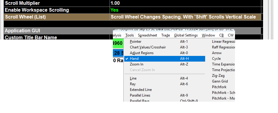 Moin Moin. A nice amendment-idea for Your upcoming feature.: Maybe it can be done by using a control-key-combination, and zooming in around the current mouse's position (Tradingview does it using the ctrl-wouse-wheel--combination). It would be helping to avoid loosing the current position (, e.g., the profile-block in TPO-graphs), if the mouse-wheel-zoom could be staying centered around, where the mouse/current-profile was=is. _Cheers, __Michael. P.S.: 1. Heeding Your first bullet-point's instruction, I did ask ChatGPT and found "Zoom in"/Alt-Z, so I do have a good workaround. 2. So, please put this suggestion to a low priority. |