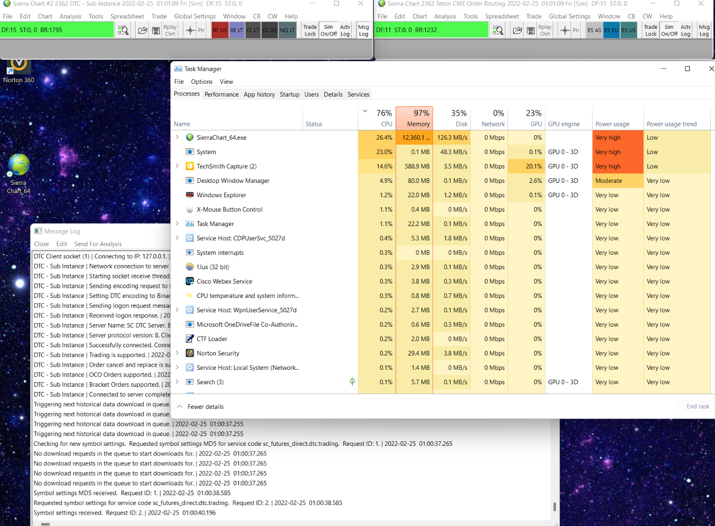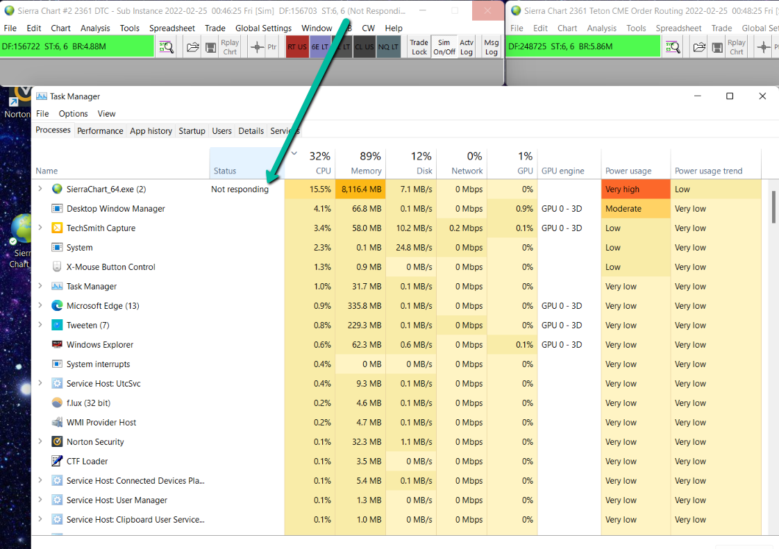 Please do not make reference to other threads. We will not make reference to those. Each issue is on its own and is different. This issue absolutely must have something to do with what you are doing with Sierra Chart and your system. It could not be a problem with Sierra Chart itself. Maybe this is related to a large amount of trade activity data. Go into the TradeActivityLogs subfolder in the Sierra Chart installation folder. What is the size of that folder and the number of files? When Sierra Chart is not running, we recommend renaming this folder to rule that out as an issue and start Sierra Chart again. Also enable Trade >> Trade Activity Log >> Edit >>Disable Trade Activity Log. Sierra Chart Support - Engineering Level Your definitive source for support. Other responses are from users. Try to keep your questions brief and to the point. Be aware of support policy: https://www.sierrachart.com/index.php?l=PostingInformation.php#GeneralInformation For the most reliable, advanced, and zero cost futures order routing, *change* to the Teton service: Sierra Chart Teton Futures Order Routing Date Time Of Last Edit: 2022-03-02 09:35:59