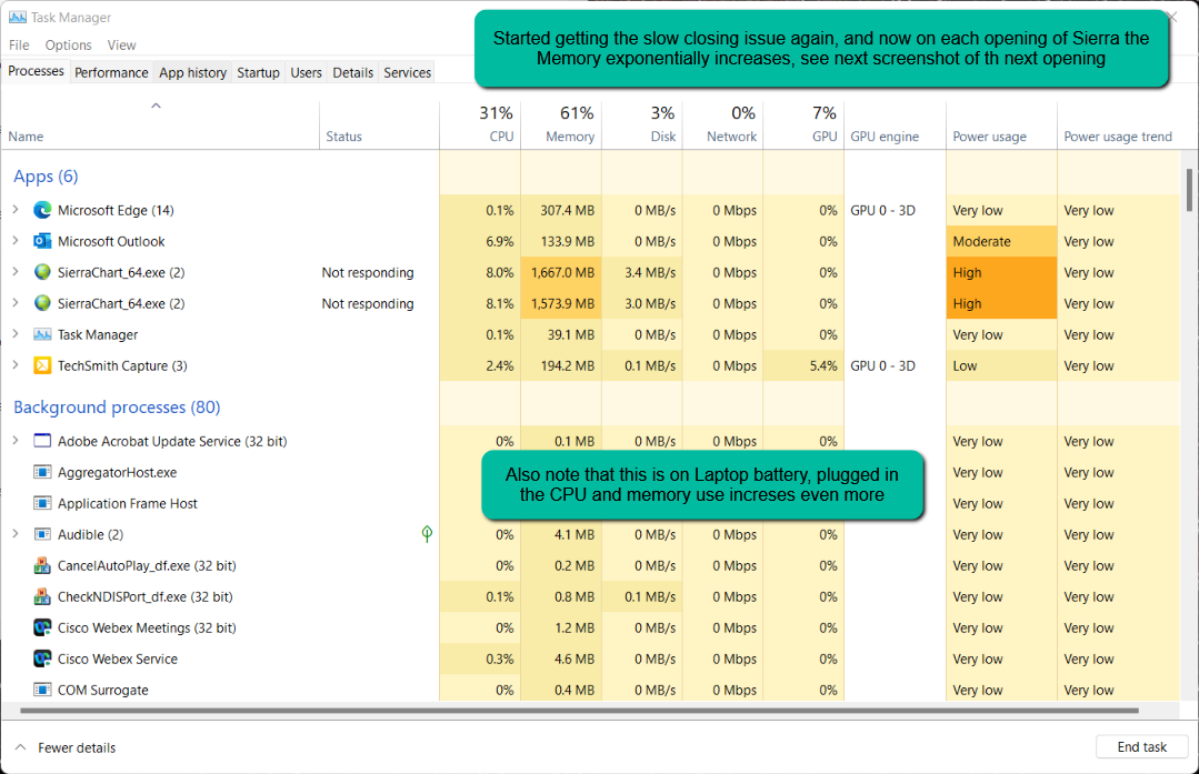Hi, this problem persists, although I don't think its anything to do with the sub-instance, it on both. In the last week I have removed and reinstalled Sierra twice, both times it rums great for a few days and the the problem comes back, and once started it seems to exponentially get worse quickly. I have noticed 2 similar issues on the support board this week: https://www.sierrachart.com/SupportBoard.php?ThreadID=71700 Extreme slowness and high CPU / RAM Usage What I have experienced is that once a slow closing and spike in CPU/ memory use occurs, it seems to be remembered and on the next occasion I open Sierra that huge memory usage is then the starting amount for Sierra. When I close the program I get another CPU & memory spike adding to the initial amount, which is then the starting amount the next time I open so its quickly increasing with every closing of the program. This is when it takes increasing longer to close the program with the not responding status. So when running smoothly, I rarely go above 100-200mb memory usage per instance, and everything opens/ closes quickly, but once this issue occurs Sierra memory allocation use quickly increases to high hundreds and then thousands as seen in the screenshots. This is without any chartbook loading on start-up. |