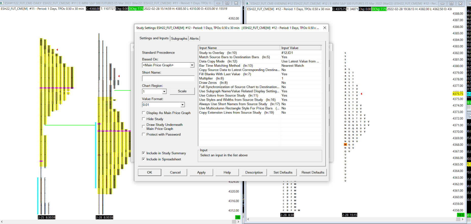 I have 2 TPO charts-#11 Day Session, #12 Evening Session. I was trying to Overlay #12(Study/Price Overlay) onto #11 but #11 is not showing up on #12. What would be the problem. https://www.sierrachart.com/image.php?Image=164609835237.png |