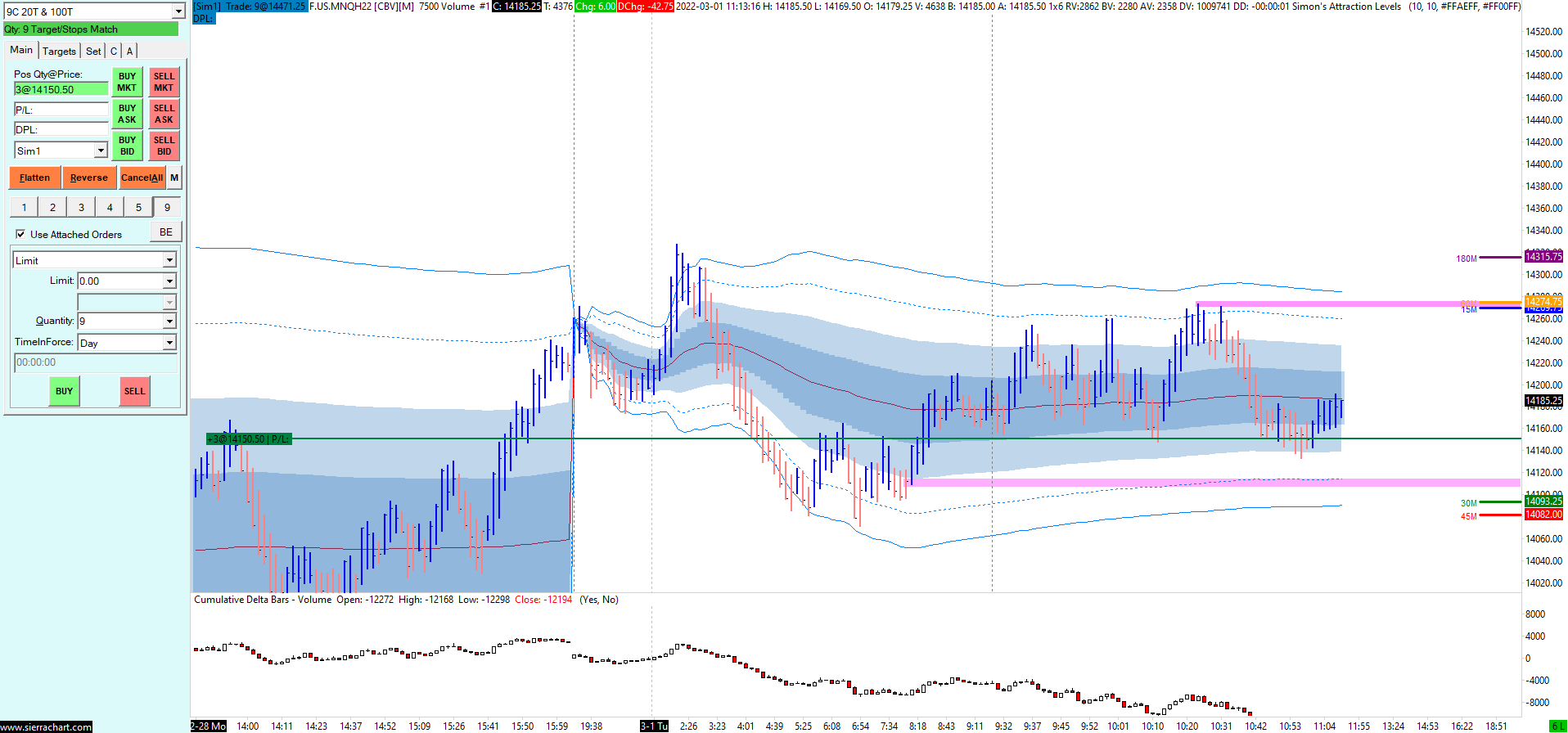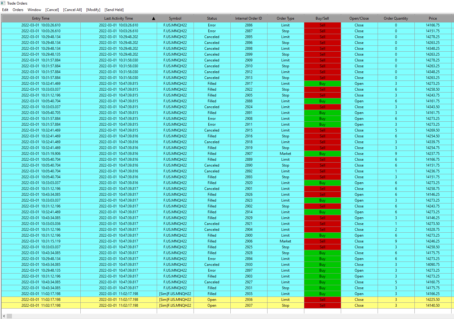 I placed a buy limit order at a certain price by right-clicking on the chart and it was executed immediately at a random price. I exited immediately. I opened up dom for chart and again placed sell order limit at a certain price and it executed at a random price. Something is seriously wrong with my platform. Can you look into this for me to see what's going on? I'm very concerned about sustaining additional losses because of this issue. Also, I switched to sim mode and again place a buy limit order using Dom at certain price, and the order was executed immediately.https://www.sierrachart.com/image.php?Image=1646151197313.png In sim mode, I placed bracket limit sell order at 14146.75 using DOM and before it could reach my target entry it executed at 14150.50 immediately upon clicking on DOM to set bracket order. The bracket order was for QTY of 9 but order was executed for QTY of 3. Also, the order was filled with incorrect QTY. Date Time Of Last Edit: 2022-03-01 16:25:47