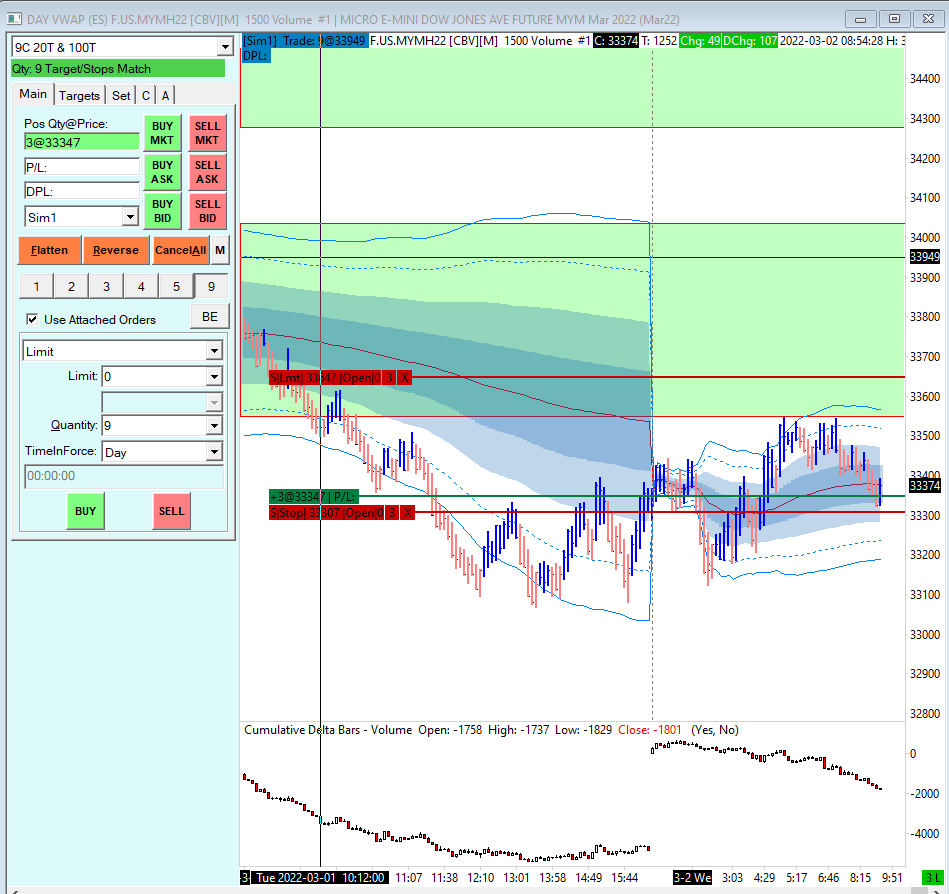 This is a platform issue. In simulation mode, in DOM when I click on a price should the buy/sell limit order be set to that price and execute once the market price reaches the set price? This is not the case with my orders. In sim mode on DOM, I place an order on MYM for 33360 by clicking on the square next to the price. The order was executed at 33347 See attached pictures. It shows Price 33360 then Average fill price of 33347. executed my price at the market price and not the price I clicked on in the DOM. This order, I place was a bracket order for QTY of 9. 6 were filled at 20ticks and 3 still opened. When I look at picture in trade orders I see only QTY of 3 and closed. Is this correct? Please help me with this issue. My platform is not working as intended. I've reached out to my broker and they said it's a platform issue they can not do anything about it. |