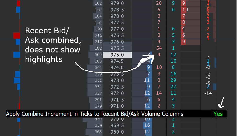 Hi everyone, this "Apply combine increment in ticks" works only for the recent bid/ask volume as it seems. Is it possible to make it work for the other options in the "Customize Trade DOM Columns" as well? I am mainly using the "Current Traded Ask and Bid and Total Volume" and the pulling and stacking column Thank you very much in advance. |
