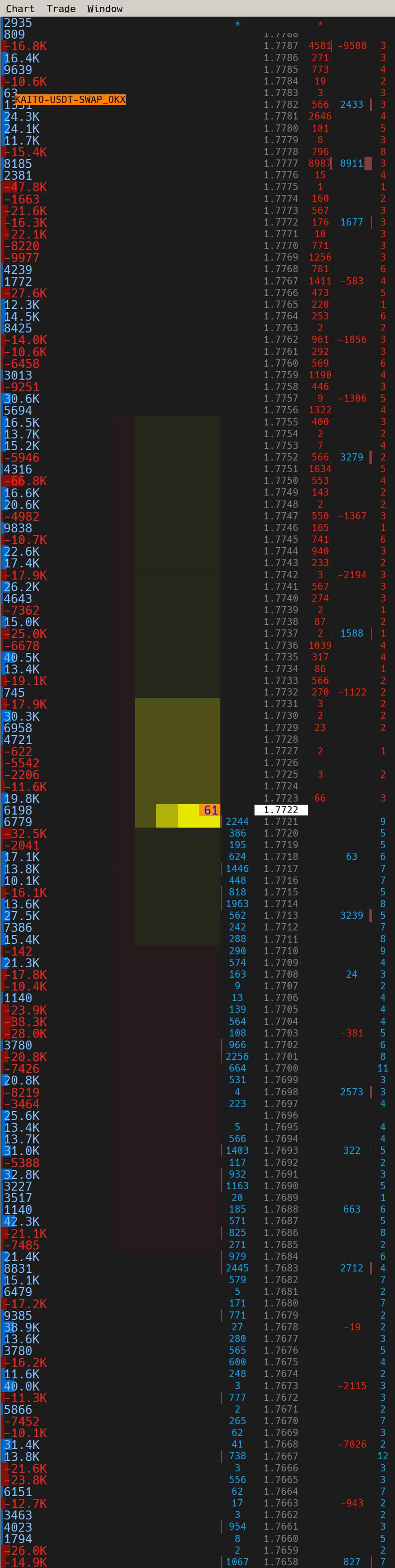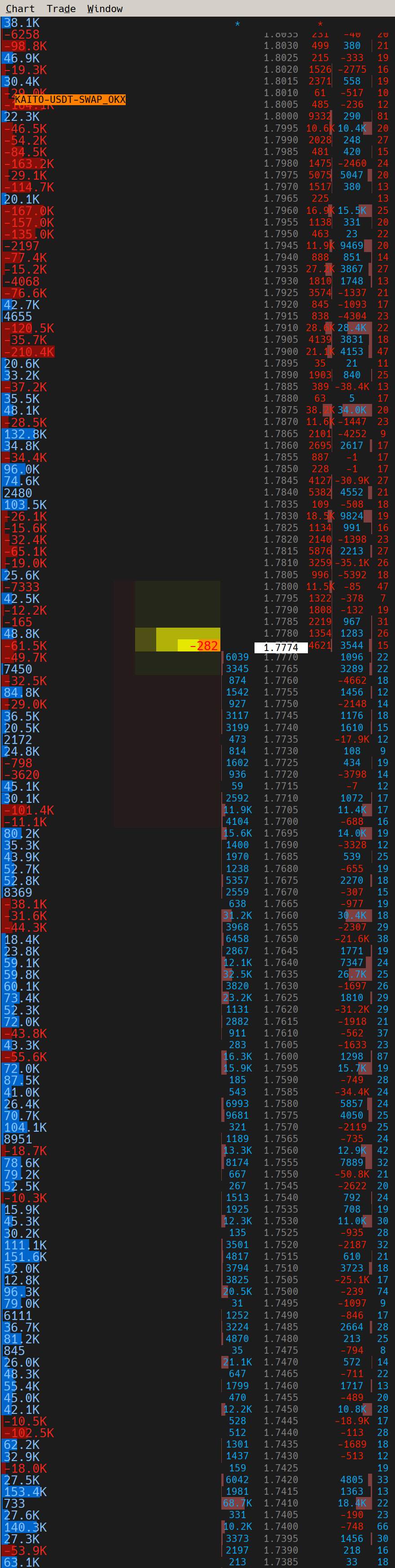 pull/stack columns also don't seem to work as expected when used as a dtc client I pre-combine the market depth data passed to the client by reading the custom data directly from file CustomSymbolSettings.dtc.xml, so my combine increment in ticks value is always set to 0 when I adjust the tick size of a symbol from large(0.0005) to small(0.0001, symbol default value), the pull/stack column does not calculate based on the new tick size, it still calculates based on the previous larger tick size(0.0005) unless I reconnect(screenshot 0.0005.jpg and 0.0001.jpg) when the tick size is not the symbol default, the numbers in the current traded total volume column are stacked together and not combined(screenshot CurrentTradedTotalVolume.jpg) |