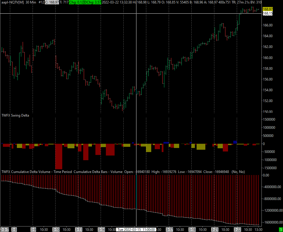 Is there something different about the Nasdaq stock feed where calculating the Delta may not work like it does for futures? In the attached AAPL chart is indicates nothing but selling overall but the price keeps going up, surely there not that much absorption going on. Any help on this would be appreciated thank you. |