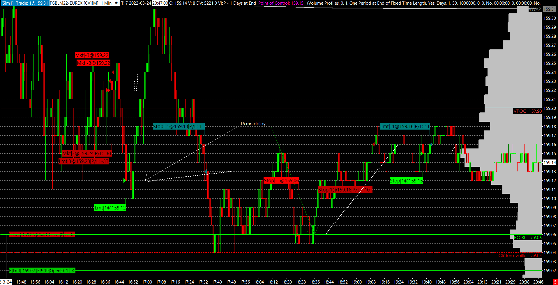 Bonjour, Voici le chart : https://www.sierrachart.com/image.php?Image=16481925394.png Autres questions : 1/ j'ai un décalage de 45mn entre l'heure du chart et l'heure en haut de la fenêtre dans le bandeau "Sierra Chart 2357 ..." => ex : 07:22:00 dans le bandeau "Sierra Chart ..." et 08:07:00 dans le chart ? 2/ comment faire apparaître le VWAP sur le DOM ? Merci Date Time Of Last Edit: 2022-03-25 08:38:38