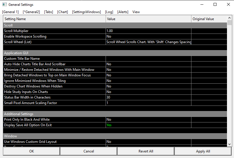In newer versions of Sierra Chart the General Settings window will look like this: https://www.sierrachart.com/Download.php?Folder=SupportBoard&download=62827 We are continuing to organize all of the settings and categorize them better in that window. Sierra Chart Support - Engineering Level Your definitive source for support. Other responses are from users. Try to keep your questions brief and to the point. Be aware of support policy: https://www.sierrachart.com/index.php?l=PostingInformation.php#GeneralInformation For the most reliable, advanced, and zero cost futures order routing, *change* to the Teton service: Sierra Chart Teton Futures Order Routing |