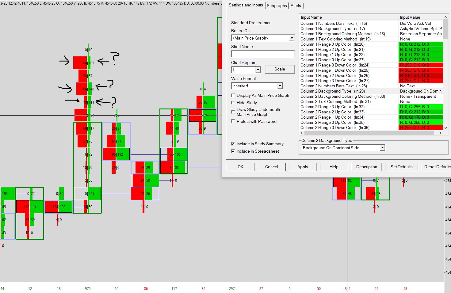 Hi there, Am a bit baffled by this issue. Have looked at the documentation, looked at support board answers and have also played around within the settings and still can't figure this out. Have attached a screenshot to show the issue. You will see that the top line highlighted has a trade imbalance of 84/105 , then other highlighted examples are 66/148 and 18/111. However the dominant side on the profile remains with the side that has the least volume. Looking at the example at the top with 84/105, the left side of 84 trades is 3 or 4 times larger than the right side of 105. Even if it is done diagonally with reading taken from the next line as on a DOM, this outsize profile bulge doesn't make any sense at all. How does this happen? I have tried many things and can't get the profile to change at all. Settings are contained within the attachment: Column 1 Text: Bid vol x ask vol Col 1 background type: Ask/bid volume split profile Col 1 background colouring method: Based on separate ask/bid volume-actual Any ideas will be greatly appreciated. I should add that the closest thing I have found to a solution is to change Col 1 background type to Ask/bid volume split profile across Bid and Ask. Still don't think it solves that weird anomaly though? Regards, Bootsyjam |