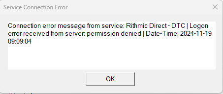 Please see attached. The error is "Connection error message from service: Rithmic Direct - DTC | Logon error received from server: permission denied | Date-Time:..." |