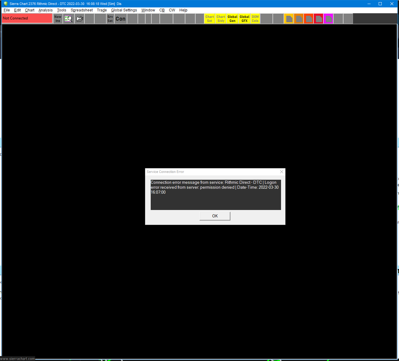 Hi, Have the same issue with tickticktrader. Though, i have paid for Denali : https://www.sierrachart.com/image.php?Image=1648670903161.png Can you help me ? I heard that it is the number of characters in the password that may be too long ? |