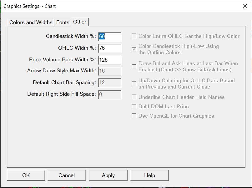 Select the "Colors and Widths" tab. Also make sure you are using the right Settings window: Graphics Settings: Introduction Sierra Chart Support - Engineering Level Your definitive source for support. Other responses are from users. Try to keep your questions brief and to the point. Be aware of support policy: https://www.sierrachart.com/index.php?l=PostingInformation.php#GeneralInformation For the most reliable, advanced, and zero cost futures order routing, *change* to the Teton service: Sierra Chart Teton Futures Order Routing |