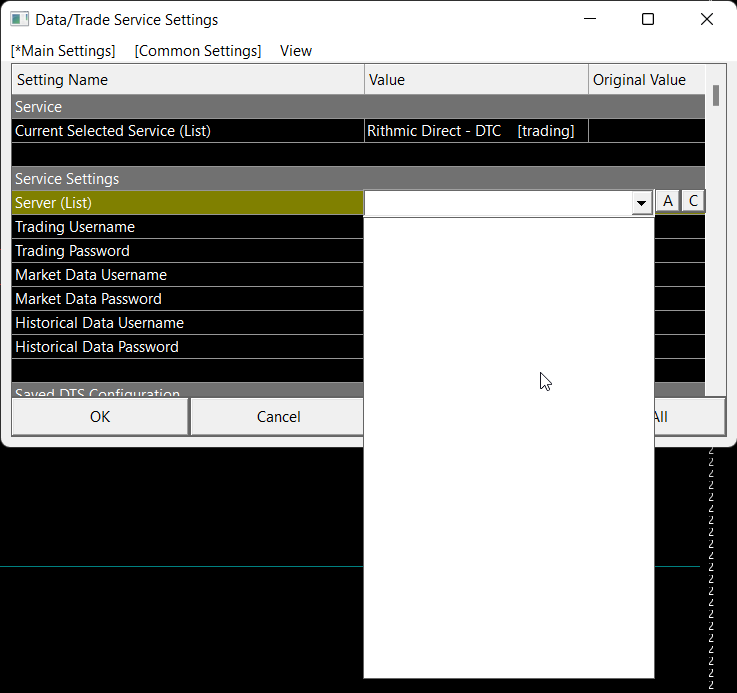 After you select the Rithmic Diret - DTC for the Current Selected Service, you need to then select OK to close that window and then wait 10 seconds and then open it again and the list of servers should be populated. Refer to the instructions at Step #9 here: Rithmic Trading Platform Service: Setup Instructions For the most reliable, advanced, and zero cost futures order routing, use the Teton service: Sierra Chart Teton Futures Order Routing |