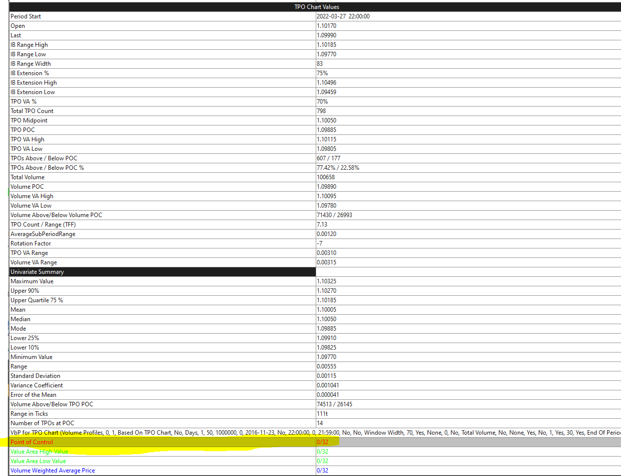 Hi, I was wondering what the 0/32 means in the univariate section of a TPO chart? When does this number change? Please refer to the attached screenshot. Does this number change when price reaches a POC? I'm trying to find a way to use naked POC values for an automated trading strategy. Is this method even available and what would be the way (direction to look for) to do it? Kind regards |