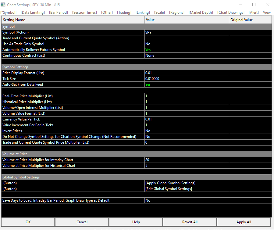 Hi, I updated my SC to the latest version on friday and now when i hit f5 for the chart settings window, the blackscreen format appears (sorry not sure how to explain better...see screenshot) as opposed to the historic version. I couldnt find if this was a simple display setting change or how to revert it back or whether this is expected behaviour with this version ive update to v2376. Thanks I could not get the screen to screenshot using the preferred method so I attached it. |