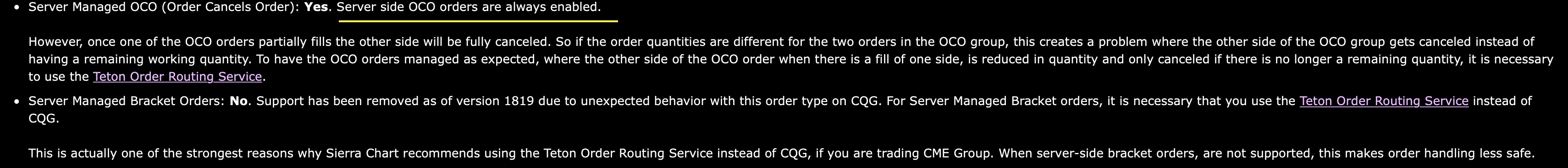 This is explained in detail, in this section and the following three sections: Attached Orders: General Management of Attached Orders You need to read through them in that order. We also want to point this out in our documentation for our Teton Order Routing Service: Trouble-free and properly managed server-side bracket orders. This is a huge advantage as compared to many of the other supported Trading services. With many of the other supported Trading services, either server-side bracket orders are not supported or there are various issues with using them. Properly managed server-side bracket orders are so important since it makes the order handling very safe and low latency. With some of the other supported Trading services, the bracket order management is on the client side with a much higher delay from when the parent order fills, to when the Target and Stop orders are transmitted. This can be for example 300 ms and higher, rather than below 1 millisecond when managed on the server as they are with this service. Server managed bracket orders, also mean that when the market is moving fast, there is a greatly reduced possibility that the stop order will be rejected. If the Stop order were rejected, it would leave the position unprotected. Server-side Bracket orders are always enabled with this service regardless of the Use Server Side Bracket Orders setting. Another advantage of server-side managed OCO and Bracket orders is that if your installation of Sierra Chart loses Internet connectivity or is closed, these orders continue to be managed on the server regardless of this and will protect the Position that they are intended for. If you are using CQG, OCO and Bracket orders are not managed properly with that service. And Bracket orders are not server-side. This is all substandard. CQG users need to move to the Teton Order Routing service for properly managed OCO and Bracket orders. Look at these posts from us in our Sierra Chart does not recommend CQG thread: Sierra Chart Does Not Recommend CQG (Various Reasons) | Post: 203188 Sierra Chart Does Not Recommend CQG (Various Reasons) | Post: 203198 Sierra Chart Does Not Recommend CQG (Various Reasons) | Post: 250123 Sierra Chart Does Not Recommend CQG (Various Reasons) | Post: 250220 Sierra Chart Does Not Recommend CQG (Various Reasons) | Post: 259762 Sierra Chart Does Not Recommend CQG (Various Reasons) | Post: 296245 Sierra Chart Does Not Recommend CQG (Various Reasons) | Post: 302703 Search for the word "Bracket" in each of these posts, and you can see our comments, regarding this issue. This is why we also strongly recommend users to get off of Transact. We have terminated support for Transact. Transact is fully unsafe in regards to attached orders because there is not bracket order support or OCO support on the server side. Transact is 100% monumentally unsafe, with OCO and bracket orders because these are not managed at all on the server side. The same situation also exists with Rithmic and Rithmic has developed integration to Sierra Chart using the DTC protocol but yet bracket orders are not supported last time we looked. If you are using CQG or Rithmic move to Teton. It makes no sense to use any other service, if you are trading CME Group. Sierra Chart Support - Engineering Level Your definitive source for support. Other responses are from users. Try to keep your questions brief and to the point. Be aware of support policy: https://www.sierrachart.com/index.php?l=PostingInformation.php#GeneralInformation For the most reliable, advanced, and zero cost futures order routing, *change* to the Teton service: Sierra Chart Teton Futures Order Routing Date Time Of Last Edit: 2022-04-06 20:37:55