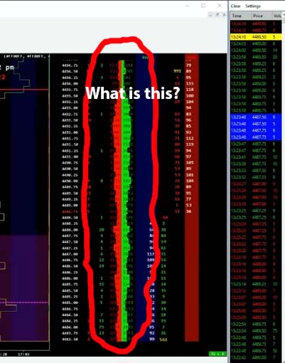 The one image shows a setup from The Pit Futures Trading youtube channel. I am trying to figure out what the vertical bar is in the DOM that has red bars on the left and green on the right?
