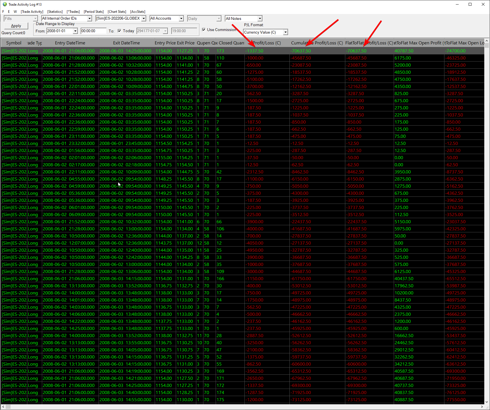 Hi ... I'm running a chart replay and am seeing two unusual things with my Trade Activity Log window that I'm hoping to understand: 1) What is the Cumulative Profit / Loss column? In the attached image (what_is_cumulative.png) you can see how when I scroll up to the very first trade, the Cumulative Profit / Loss seems to display the FlattoFlat Profit/Loss? This doesn't correspond with what I've read in the documentation on that column (and what would make intuitive sense ... a trade-by-trade running total). Why is this? In the edit menu, the only option I have checked is use LIFO matching. 2) In the second image (trade_ordering.png), you can see sometimes I appear to be getting orders out of order. Trade orders appear to be sorted by Entry DateTime but not always? |