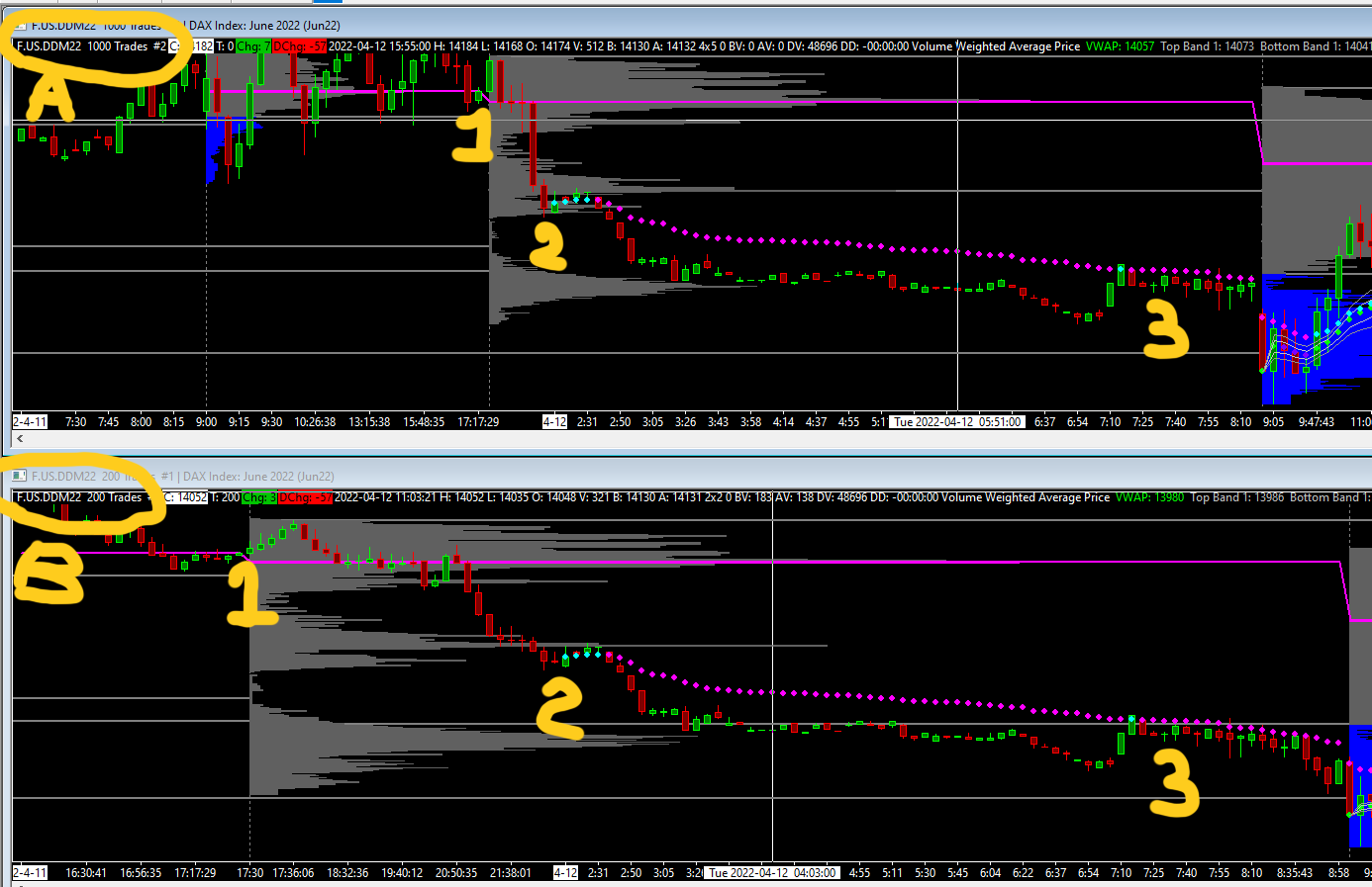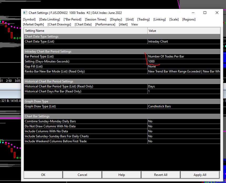 thank you for your answare. I attached a new screeshot. Is from DAx, the one above (A) set as 1000 ticks per bar, the one below (B), 200 ticks per bar. As you can see from the point 1 to the point 2, the graph above has less bars, as it should be( more trades per bar, less bars). But from poit 2 to poit 3, the bars look the same to me and it doesn't make sense. What do i do wrong? |