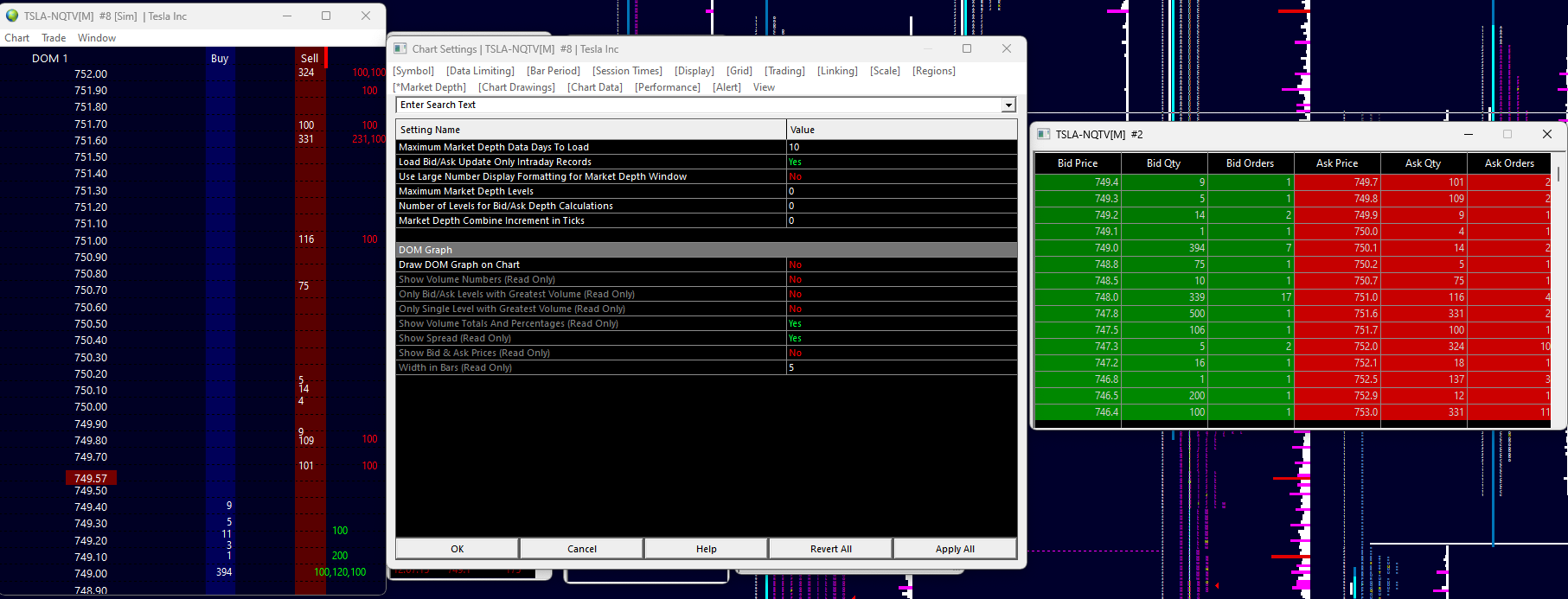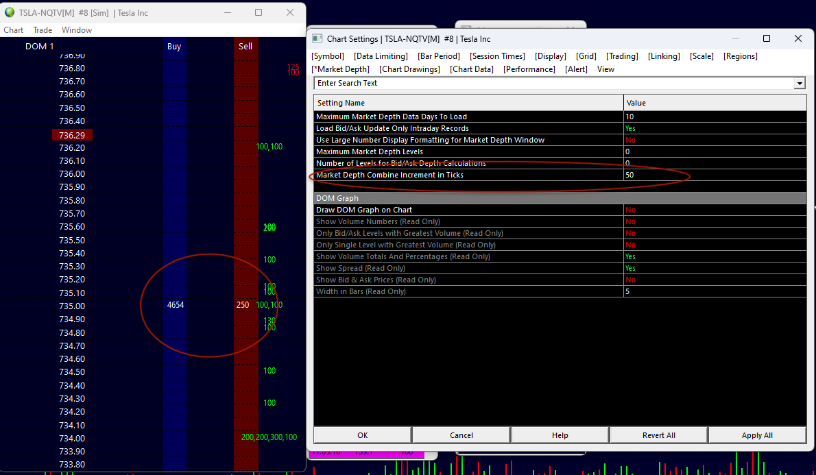 Let's go back to the beginning with this. Please set the Market Depth Combine Increment in Ticks to 0. Then please give us a screenshot of your Tesla DOM showing the Bid/Ask depth values. It looks like you are not getting the full data for some reason.