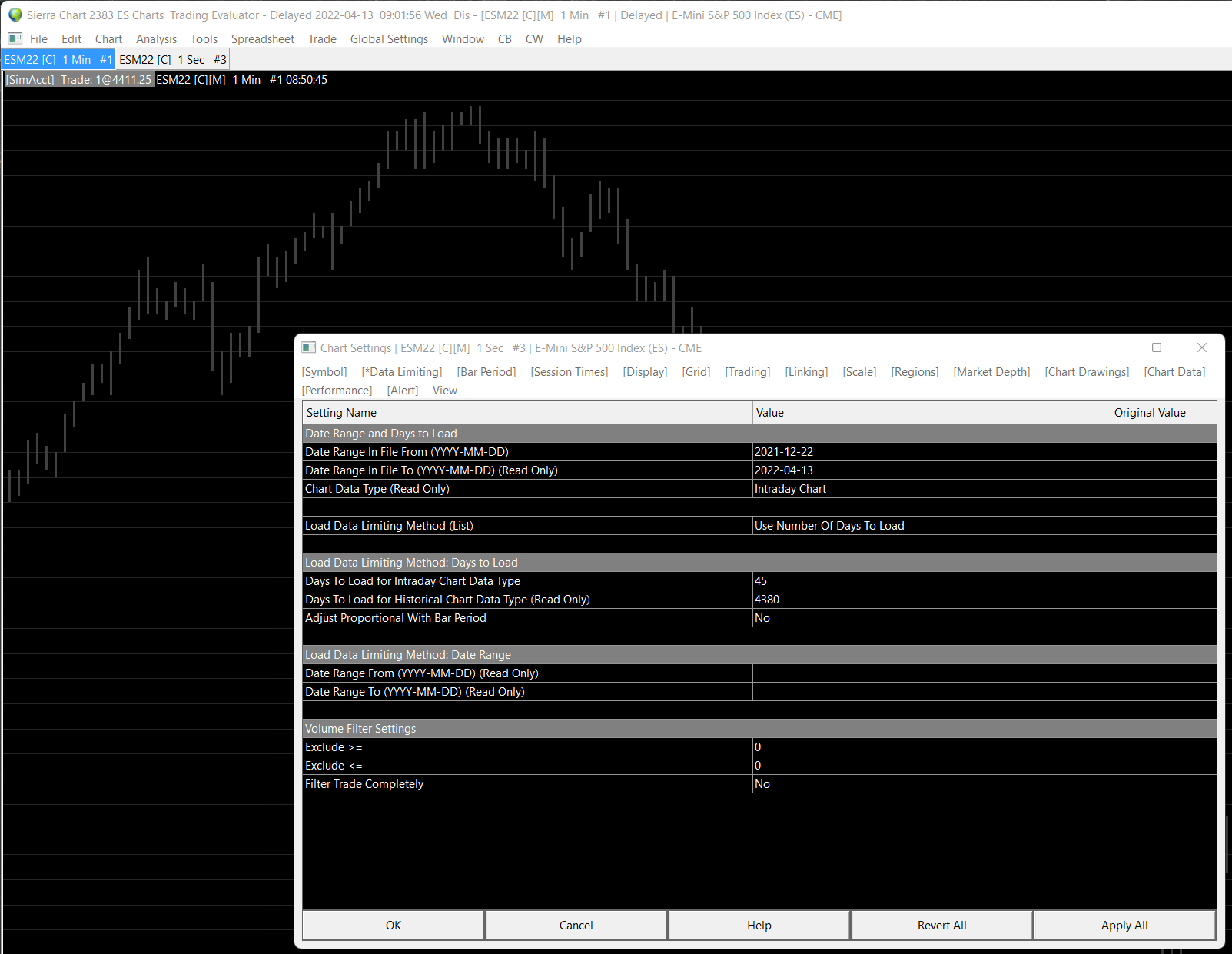 This has not yet been tested but we have added this variable which you can set to 1: s_ACSOpenChartParameters::UseExactMatchForDaysToLoad This is in the latest prerelease. Sierra Chart Support - Engineering Level Your definitive source for support. Other responses are from users. Try to keep your questions brief and to the point. Be aware of support policy: https://www.sierrachart.com/index.php?l=PostingInformation.php#GeneralInformation For the most reliable, advanced, and zero cost futures order routing, *change* to the Teton service: Sierra Chart Teton Futures Order Routing |