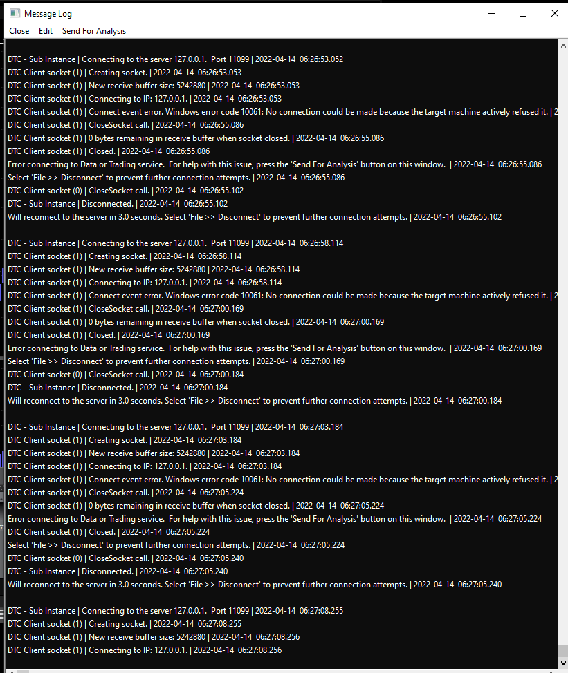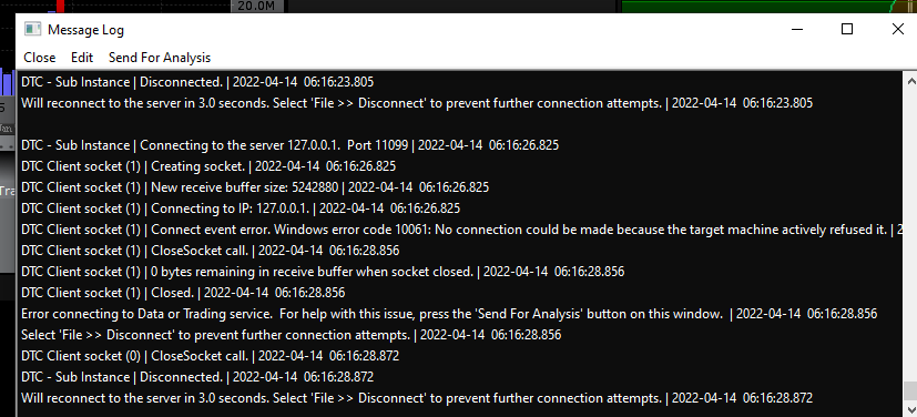 And did you start this sub instance with File >> New Instance? How many instances of Sierra Chart are you currently running not including this sub instance? Sierra Chart Support - Engineering Level Your definitive source for support. Other responses are from users. Try to keep your questions brief and to the point. Be aware of support policy: https://www.sierrachart.com/index.php?l=PostingInformation.php#GeneralInformation For the most reliable, advanced, and zero cost futures order routing, *change* to the Teton service: Sierra Chart Teton Futures Order Routing Date Time Of Last Edit: 2022-04-14 14:00:41
