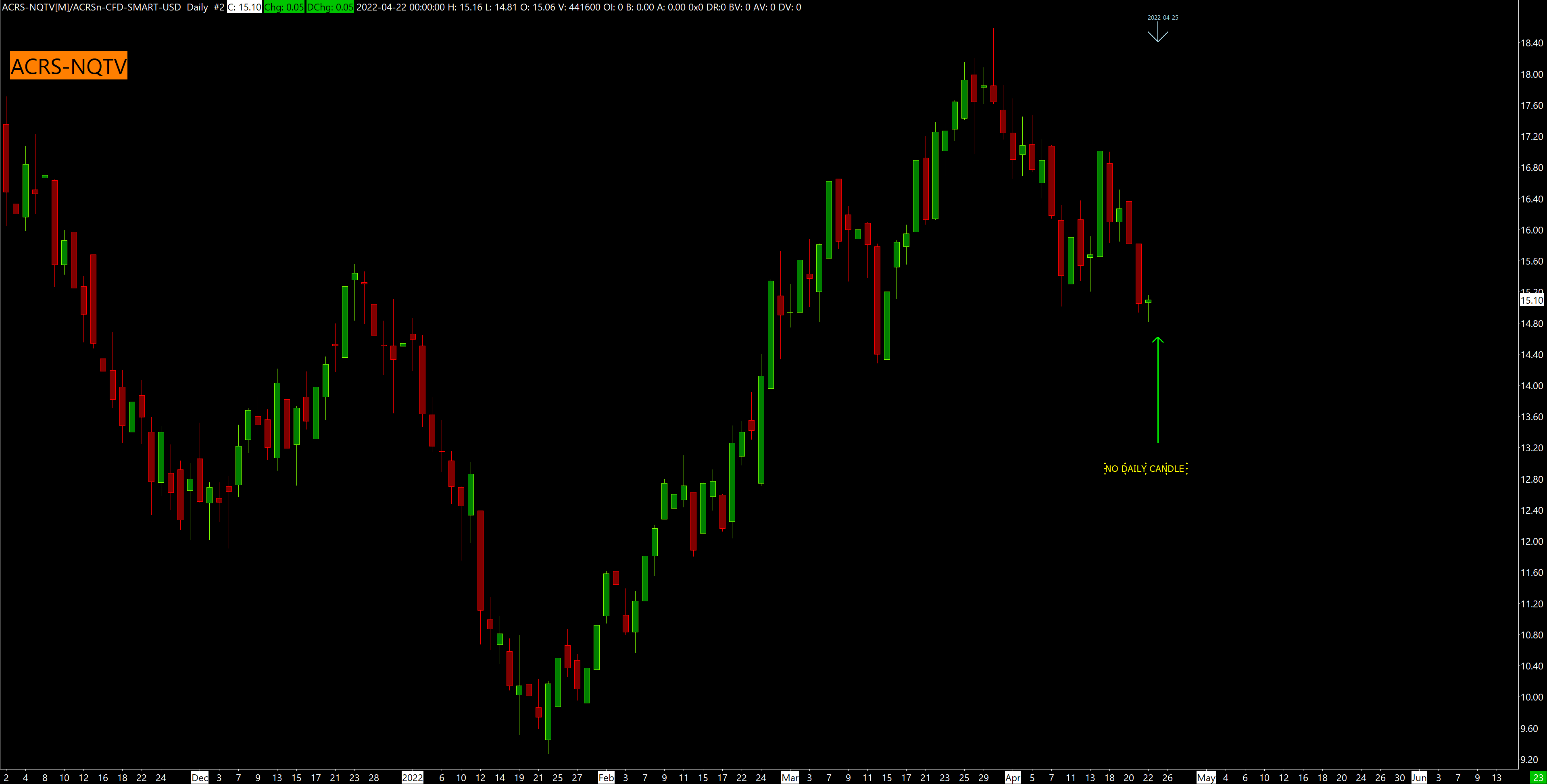 Here is what fixes it. For the charts where I have an open trade, I had the symbol for interactive brokers to trade it since I cannot trade the NQTV symbol. It only happens in charts I am trading. Now I am short this stock ACRS. But the IB symbol is ACRSn-CFD-SMART-USD I do not trade the stock directly; I trade CFD since I am not US resident. Now here is what is Interesteing. If I go into chart and DELETE the trade symbol "ACRSn-CFD-SMART-USD" then the daily bar magically appears when I do a delete data and download. BUT now I cannot see my order fills and orders. So I have to use intraday if I want to see my orders and fills. So the error only happens to me when I put in an IB symbol in the chart settings so I can manage my trade form the chart. Otherwise your feed works fine. |