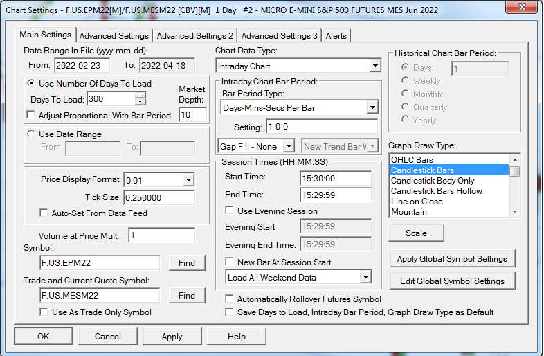Hi, I would like to set up an intraday chart with daily bars starting at 3:30:00 PM CEST (which is the open of the US market) and ending at 3:29:59. I have attached what I have done in the chart settings. However, I get sunday bars on my chart. If I choose "No Not Load Weekend Data", I no longer have friday bars but I still have sunday bars (which I think include monday overnight data). What I want is a bar beginning on friday at 3:30:00 PM and ending on monday at 3:29:59 PM (so it would include the weekend gap, if there is one). I read this page: Chart Session Times: Load Weekend Data Setting (Chart >> Chart Settings >> Session Times) but I can't find what to do. Thanks for your help. |
