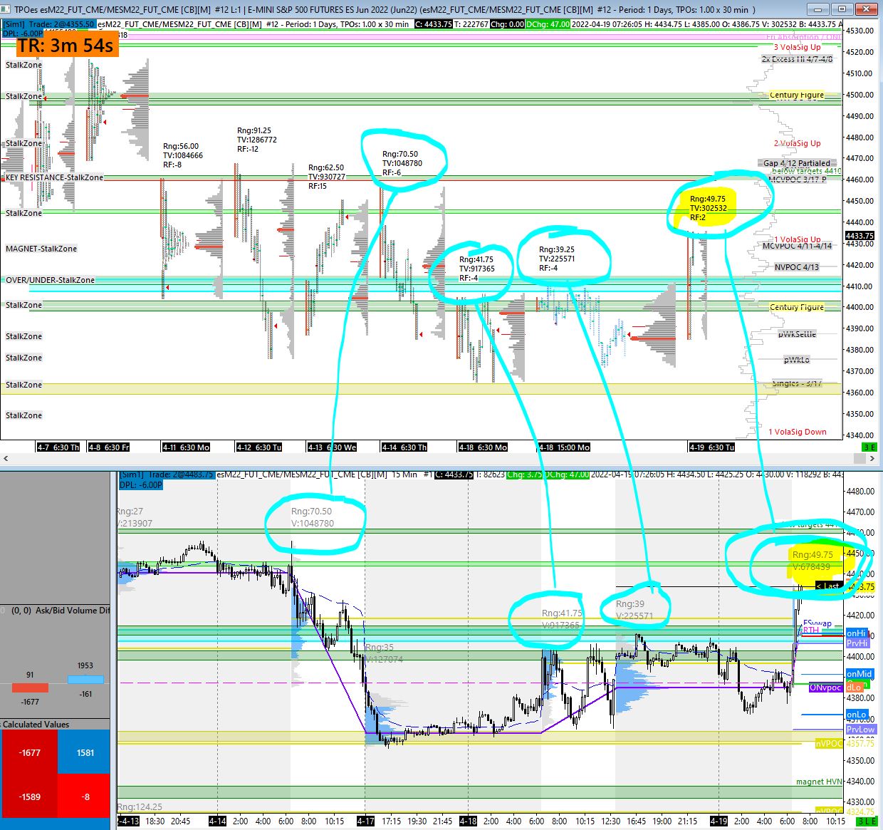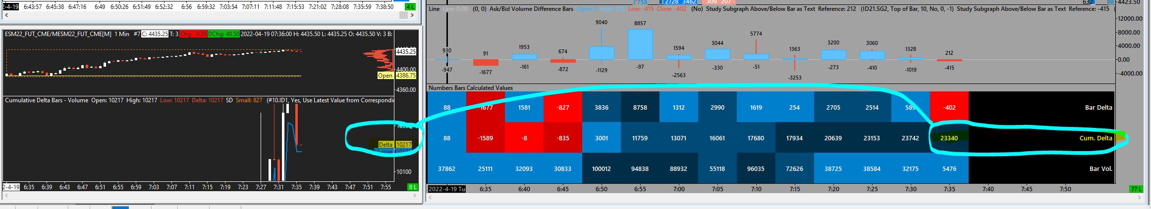 Please see attached chartbook. I am comparing cumulative delta values between chart #7 (Delta), and chart #2 (5minFP-es) I am comparing total volume between the RTH VPB on chart #1 (PNFes) and volume on RTH session of chart #12 (TPOes) |