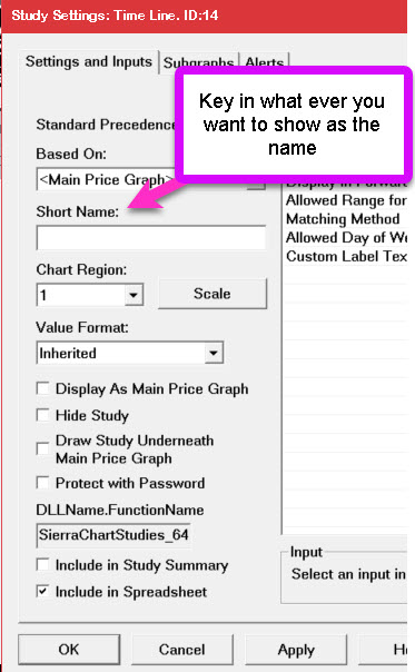 Maybe this is what you are looking for. Chart Studies: Study Settings Window Settings and Inputs Tab >> Short Name Use the Short Name setting to give a study a short or custom name to display as an alternative to the default study name in the Region Data Line for the chart region where the study is located on the chart and to display in the Chart Values windows. JohnR |