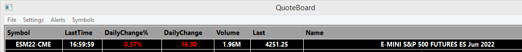 Hello Today, 04/22/2022, at approximately 16:00 PM EST, I noticed on my ESM22-CME chart and Quote Board the Daily Change % and Daily Change fields reset to zero and continued their updating until the market close at 17:00 PM EST. The final closing values on my ESM22-CME chart and Quote Board are as follows: Daily Change % -0.37% Daily Change -16.00 The final closing values from https://www.cmegroup.com/markets/equities/sp/e-mini-sandp500.contractSpecs.html for 04/22/2022 are as follows: Daily Change % -3.17% Daily Change -139.25 The Symbol Settings for ES?##-CME are as follows: Time Zone: New York (-5 EST / -4 EDT) Session Start Time: 09:30:00 Session End Time: 17:00:00 Evening Start Time: 18:00:00 Evening End Time: 09:29:59 The Chart Settings for ESM22-CME are identical to the above symbol settings values. Are there any other parameters I may have missed which would cause this anomaly? Thank you in advance for your support. Warmest Regards Andy |