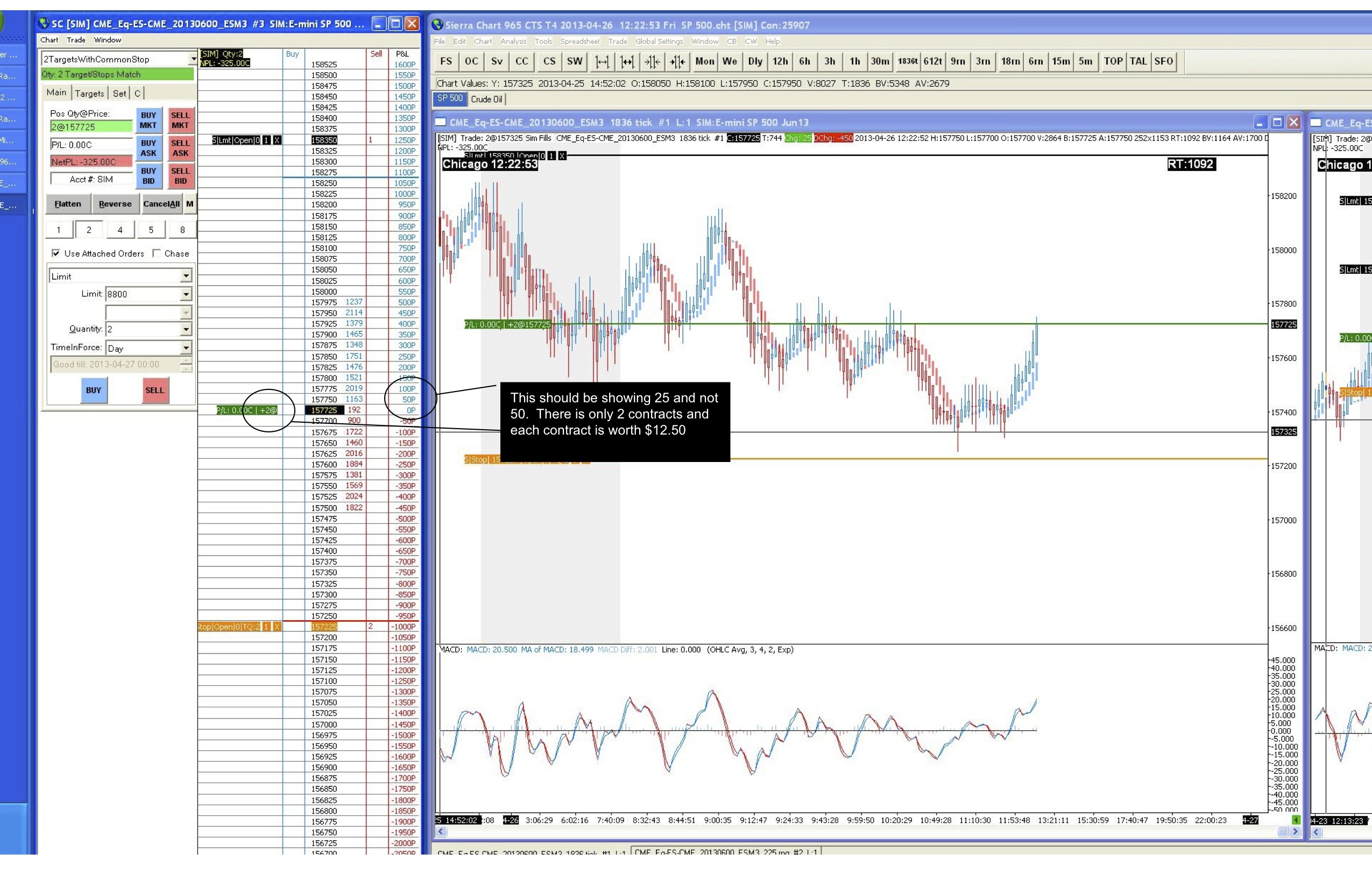 I pulled up the Trading DOM for the ES and simulated a 2 lot trade. The P&L column shows double what the tick value should be. For example each tick is showing quadruple what it should be. For a 2 lot each tick should report $25.00, but it is showing $50.00. Each tick per lot on the ES is $12.50. I executed a trade for 2 lots and each tick was showing $50.00. The trade stopped out at 2 points (8 ticks) and shows a $400.00 loss whereas it should have been a $200.00 loss. Any idea what I need to adjust? Thanks, Scott Perry |