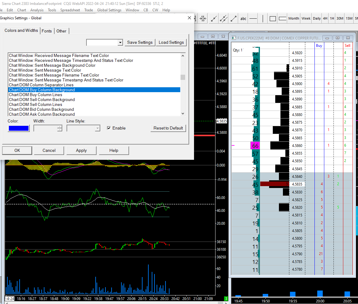 I have spent the last four hours trying to change the background colors for a dom I want to setup. I have been through EVERY single option and yet can't get it to work. I am attaching a file to show what seems to be the correct choice but the background does not change. I am also trying to get the DOM not to split the background colors above and below the bid/ask and I click enable/disable both for background and still it is split. I also don't see where the option is to change the background for the price. I know this is allot of questions but I have really tried and have so far wasted my whole day. I was trying to send a screen shot but you won't accept a simple screen shot and I have NO idea what you want. Not everybody is tech savy that uses your program. I am using global settings, choosing background color for the buy and sell columns and NOTHING changes |