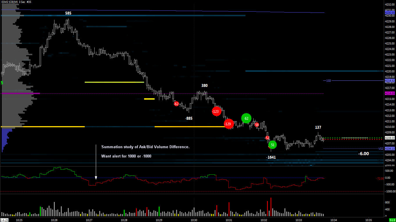 I have a Summation Study of the As/Bid Volume difference. Would like an alert for 1000 or -1000. Normally I would just use a horizontal line and put alert on that. For some reason this does not work. (I guess because it is a Summation Study) Thanks |