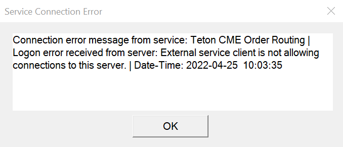 There was an issue which has been resolved. Refer to the following: Teton Interruption Around 4 PM US Eastern time For the most reliable, advanced, and zero cost futures order routing, use the Teton service: Sierra Chart Teton Futures Order Routing |