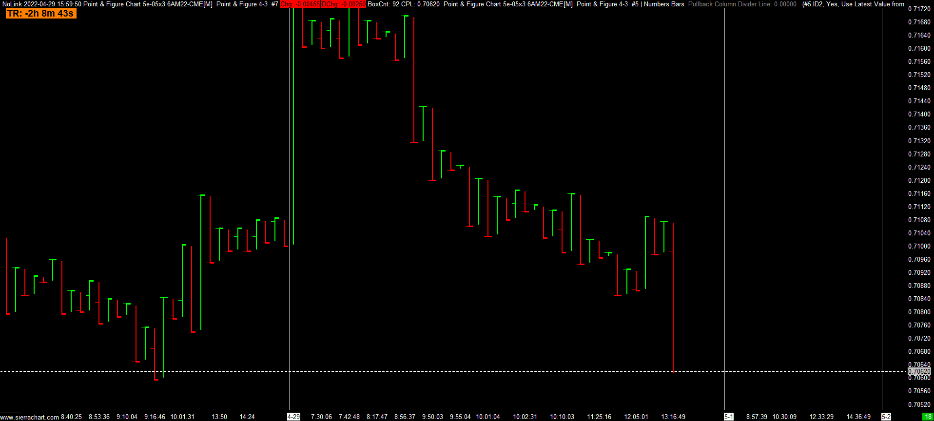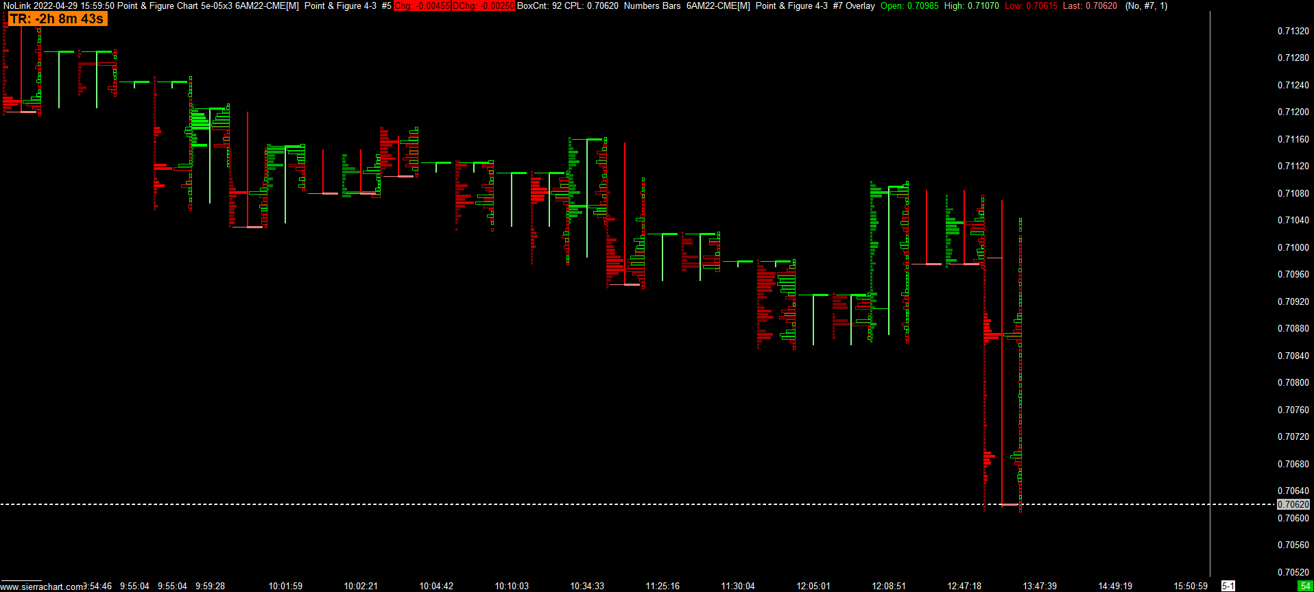 I have a point and figure OHLC chart with alternating red and green bars which is what I want. I have a numbers bar with the same session time, box size and reversal size as the OHLC chart. I'm trying to overlay the OHLC bars on to the numbers bar or use a study/Price Overlay to overlay the number bars onto the OHLC chart. When I do this the OHLC bars are not alternating red and green bars. Can someone point me into the right direction. See the two attached charts. https://www.sierrachart.com/image.php?Image=1651284545792.png https://www.sierrachart.com/image.php?Image=1651284710367.png |