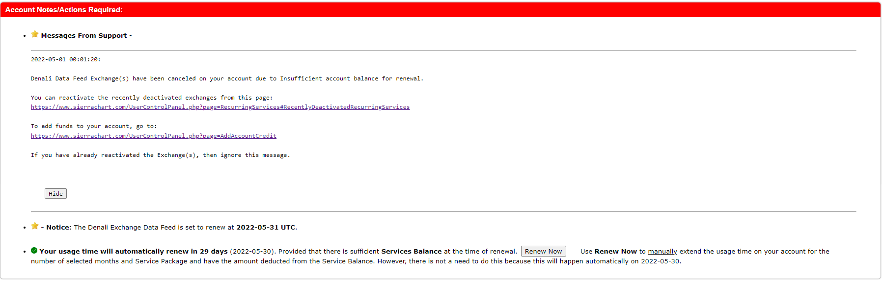 Yes you do have to pay again. The exchange fees have to be paid in full each and every month. There are no refunds and they are not prorated. You need to add credit here: https://www.sierrachart.com/UserControlPanel.php?page=AddAccountCredit And reactivate the exchange here: https://www.sierrachart.com/UserControlPanel.php?page=RecurringServices#RecentlyDeactivatedRecurringServices Sierra Chart Support - Engineering Level Your definitive source for support. Other responses are from users. Try to keep your questions brief and to the point. Be aware of support policy: https://www.sierrachart.com/index.php?l=PostingInformation.php#GeneralInformation For the most reliable, advanced, and zero cost futures order routing, *change* to the Teton service: Sierra Chart Teton Futures Order Routing |