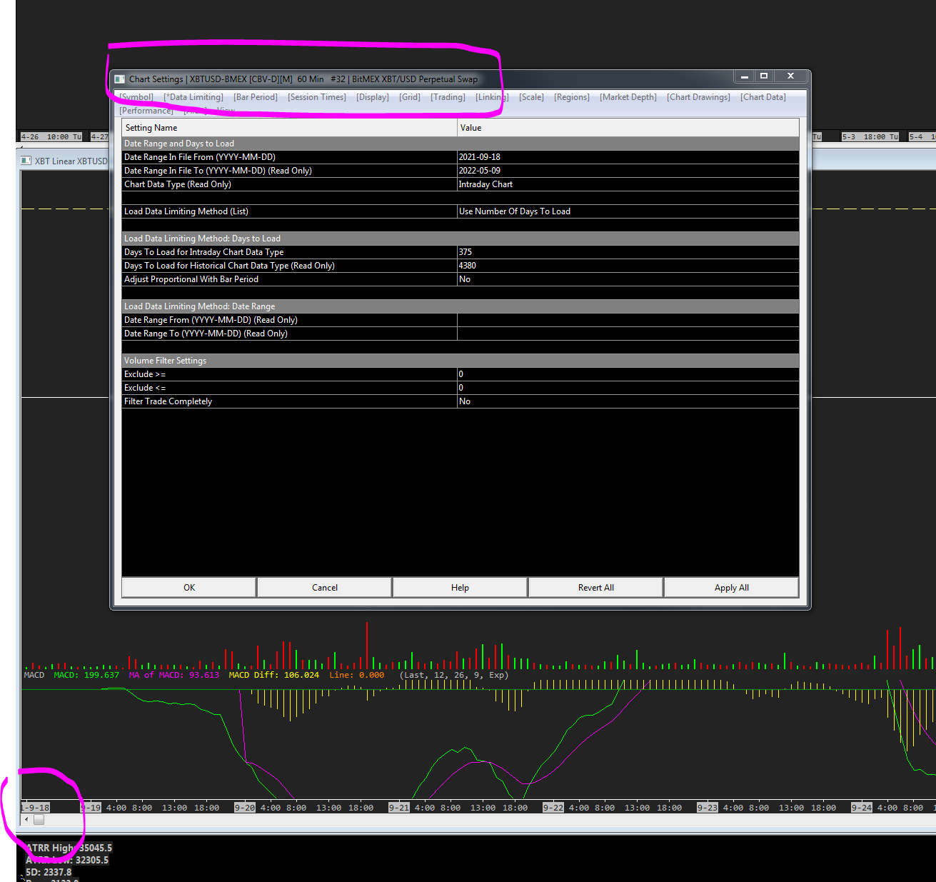 Hi guys, I have asked everyone at OFL and they can't figure it out so I need your help. I have 2 separate instances on my pc. Each with its own login as one is connected to Teton, the other is SC data all services. It is with all services I am having issues with BUT I think it's XBTUSD specific. I cannot get an intraday chart on XBTUSD going back any further than early sept of last year. On that instance, I also have an ES chartbook and I can go back as far as I want intraday, it is only with bitcoin perp contract that it stops. The daily contract I can go far back. I went into global settings at first but then once I saw I can get tick data back to early 2021 on es and nq I realise it's an issue with xbtusd. Can you help me? I am desperate to see 'under the hood' of the daily chart as that's how I find my levels. Now that btc is down at 33000 you need to go back a year to see price action at that level. Thank you guys |