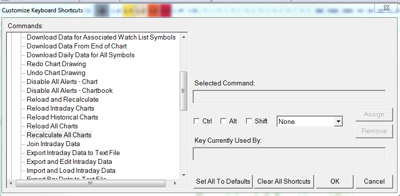 1. Automatic Trendlines: is it possible to get this study complimented by the Swing H-L study? If not, is it possible to get the code for both of these studies? 2. Spreadsheets and multiple chartbooks: I have 30 products, meaning 30 chartbooks, to trade. I have created a spreadsheet for certain timeframes to check for certain study conditions. If I were to create a spreadsheet for each individual chart, then I would be at 120 spreadsheets. This would allow me to receive the alerts, but I wonder how much memory and computing power would it cost. Maybe you have a better solution? I have tried to recalculate when moving from one chartbook to another, but there seems to be some challenges in this as well. 3. The custom key for the function "recalculate all charts" fails to be customized. See attachment 4. Is it possible with the scan function to check all my 30 products with only 4 spreadsheets? Please see number 2 for further understanding. Date Time Of Last Edit: 2022-05-09 17:43:22