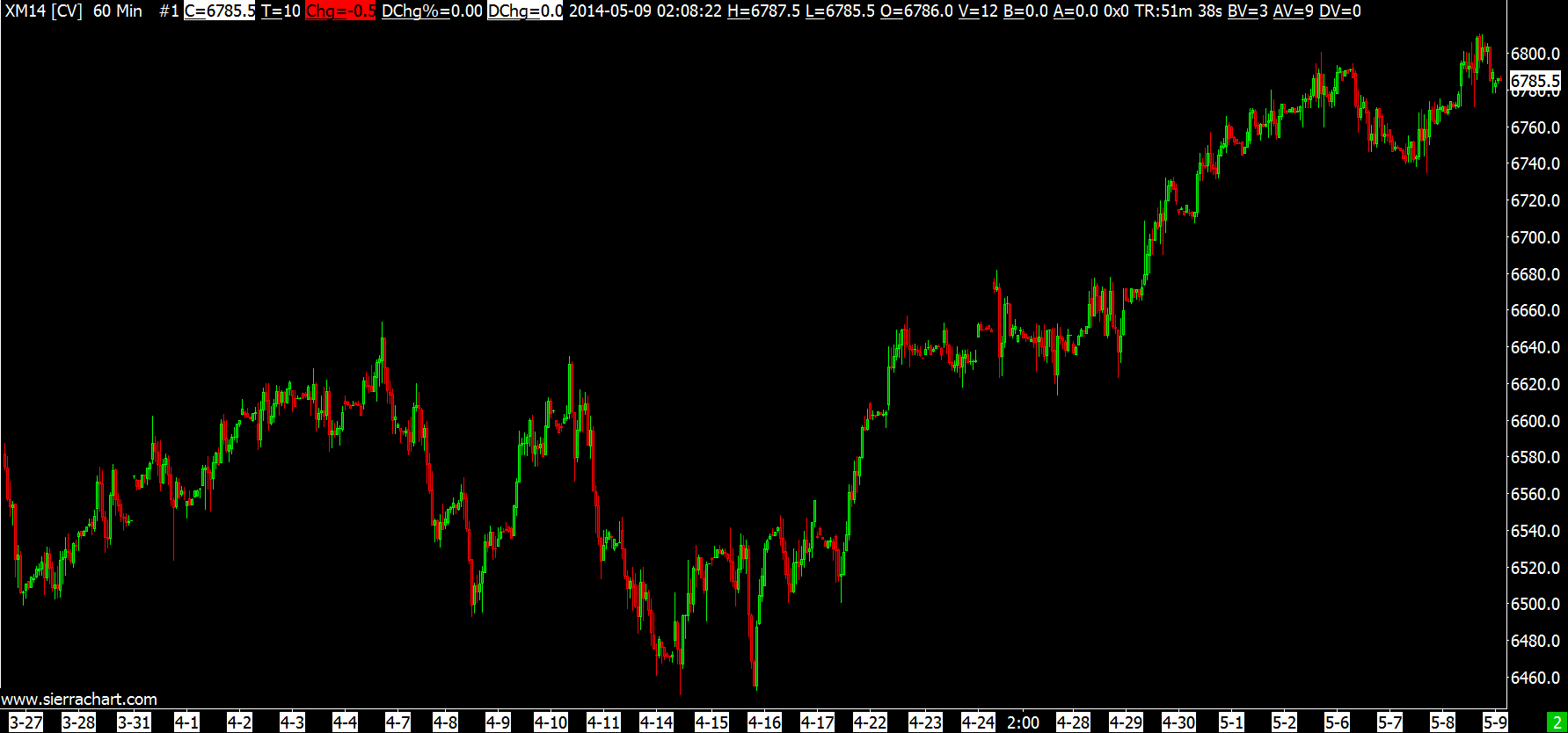 The volume-based rollover also works correctly for the Intraday chart: http://www.sierrachart.com/image.php?l=1399604045631.png However, if you are missing any data, then re-download the data following these instructions: http://www.sierrachart.com/index.php?l=doc/doc_ContinuousFuturesContractCharts.html#ReDownloading Sierra Chart Support - Engineering Level Your definitive source for support. Other responses are from users. Try to keep your questions brief and to the point. Be aware of support policy: https://www.sierrachart.com/index.php?l=PostingInformation.php#GeneralInformation For the most reliable, advanced, and zero cost futures order routing, *change* to the Teton service: Sierra Chart Teton Futures Order Routing Date Time Of Last Edit: 2014-05-09 02:55:25