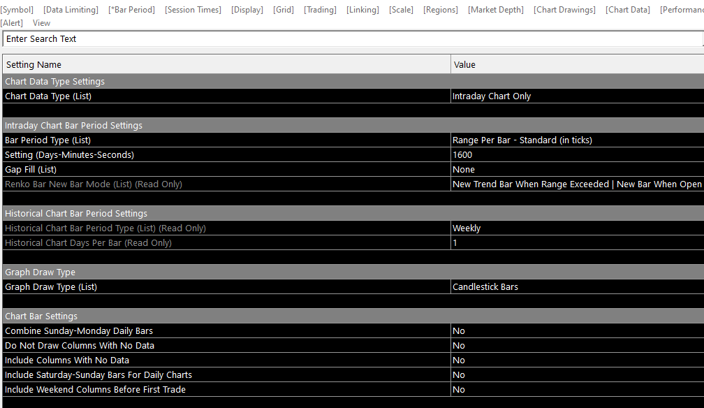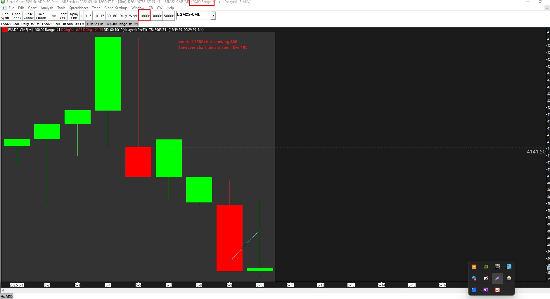 You have a 400 Range chart, not a 400 trades/tick chart. Refer to the information at the following link for the setup for a Tick chart: Chart Settings: Number of Trades Per Bar (Chart >> Chart Settings >> Bar Period >> Intraday Chart Bar Period Settings >> Bar Period Type) For the most reliable, advanced, and zero cost futures order routing, use the Teton service: Sierra Chart Teton Futures Order Routing |