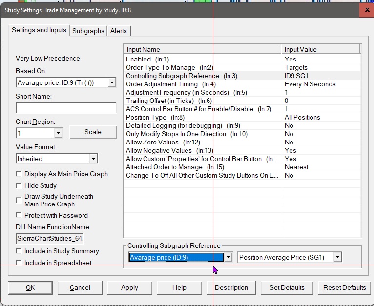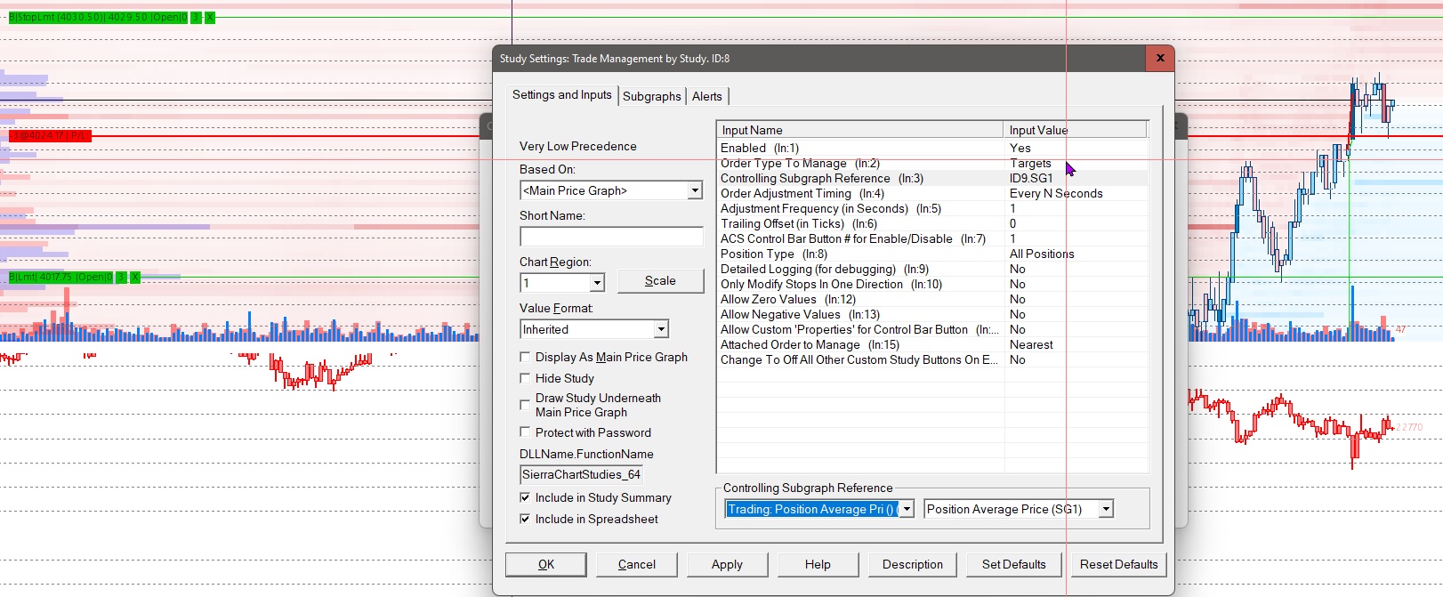 The Trading: Position Average Price study can work as the reference for the Trade Management by Study study. Just make sure you are referencing that particular study in the Controlling Subgraph Reference Input on the Trade Management by Study. You may also want to set the Trailing Offset to 0, which will move the Target to the exact value of the Position Average Price. The steps you would want to follow would be to setup the studies but keep the Trade Management by Study Input for Enabled set to No. Then when you have a position open and you want to move the target, then set the Enabled to Yes and after the set number of seconds (assuming you are using seconds to define the time for the update) the target should move to the Position Average Price. For the most reliable, advanced, and zero cost futures order routing, use the Teton service: Sierra Chart Teton Futures Order Routing |