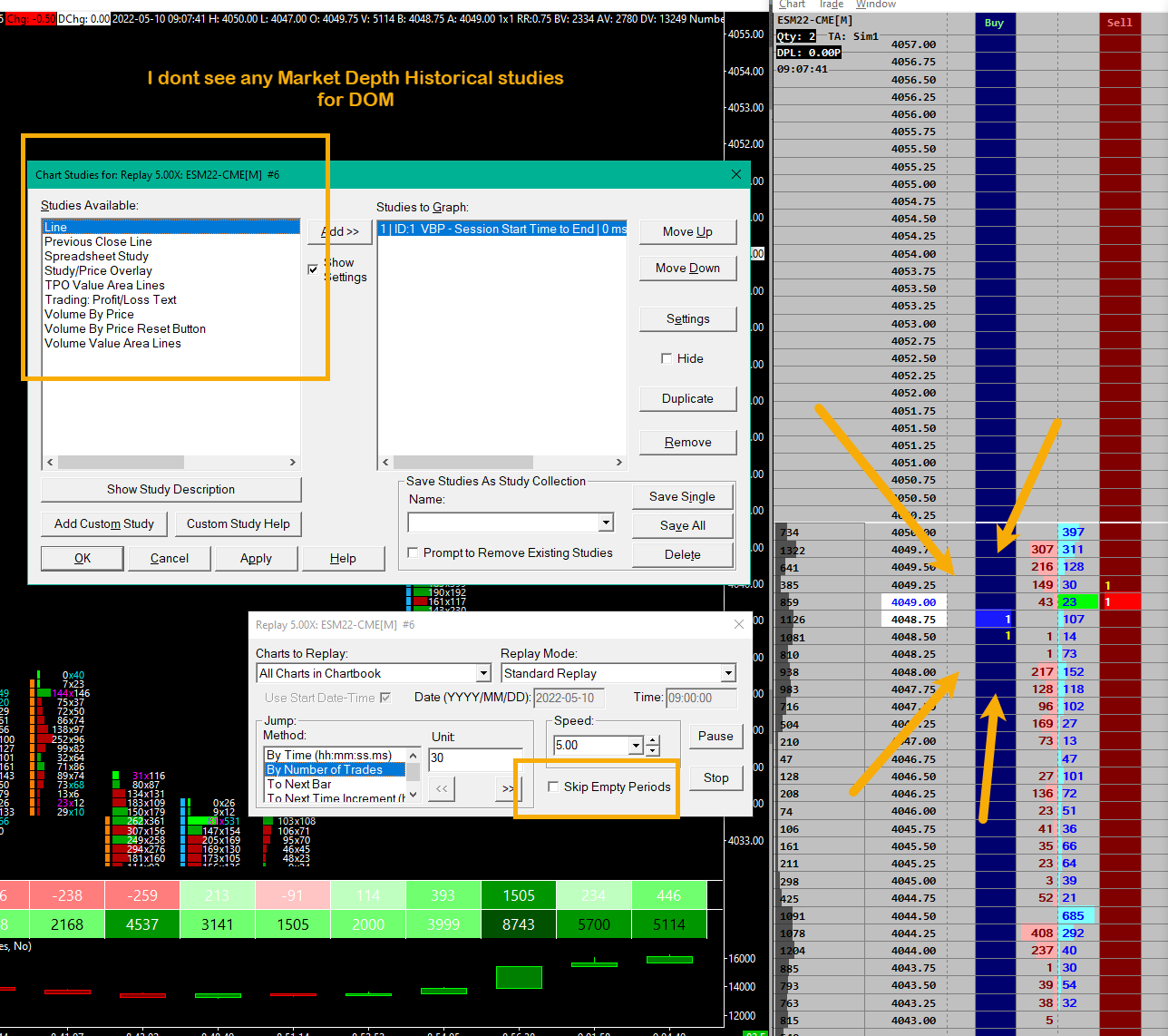 Sorry - we did not check your exchanges as your original post mentioned replay, so we assumed it was a replay only issue. The problem is that you do not have any exchanges activated that include Market Depth. You can change your active exchanges at the following link: https://www.sierrachart.com/UserControlPanel.php?page=DenaliDataFeed#Exchanges For the most reliable, advanced, and zero cost futures order routing, use the Teton service: Sierra Chart Teton Futures Order Routing |