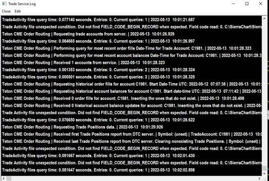 The error you are getting is related to a specific trade activity log file (or files) that appear to be corrupt. You would just need to delete the files that are being referenced in your Trade Service Log. Note that this will not have any impact on your trading. For the most reliable, advanced, and zero cost futures order routing, use the Teton service: Sierra Chart Teton Futures Order Routing |