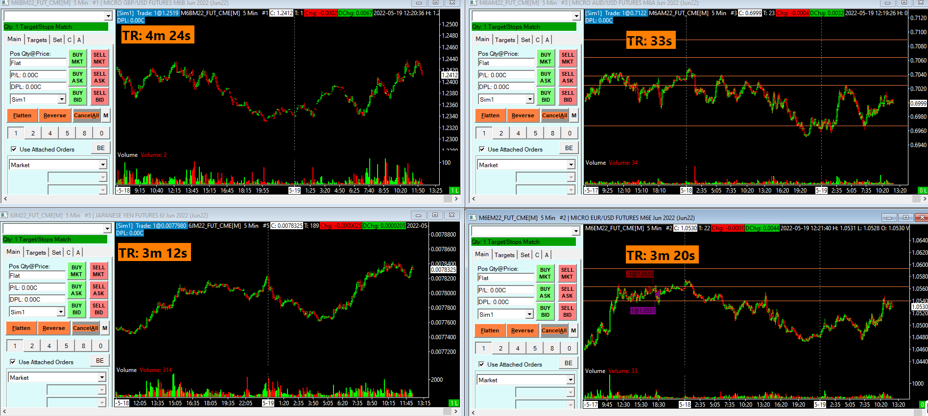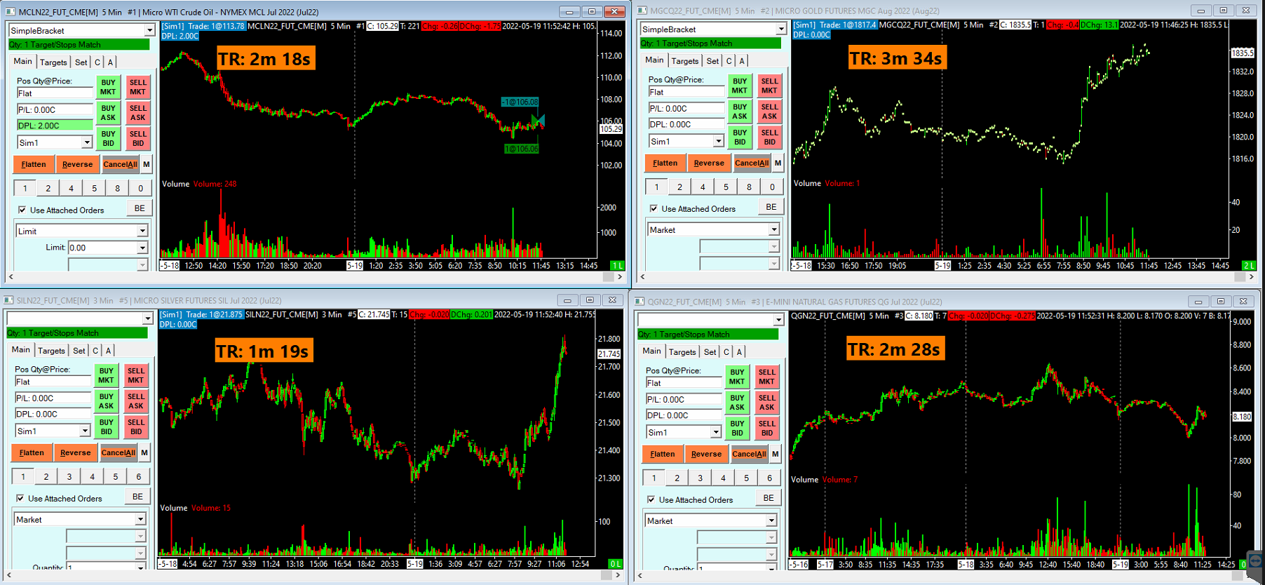 First of all, the symbols you are looking at are relatively low volume, meaning the trades are fewer. Therefore when you say it is slow, we think that is just simply the particular trading for that symbol. For example, open a chart for ESM22_FUT_CME which has volumes for a 5 minute bar of around 20000. See how that chart acts in comparison to the others. And in terms of the Countdown Timer, there are times when it can skip a second or so just because of how the charts need to calculate. But also refer to the information here: Countdown Timer: Inaccurate Countdown Time Value or Amount Remaining | Countdown Time Not Changing For the most reliable, advanced, and zero cost futures order routing, use the Teton service: Sierra Chart Teton Futures Order Routing |