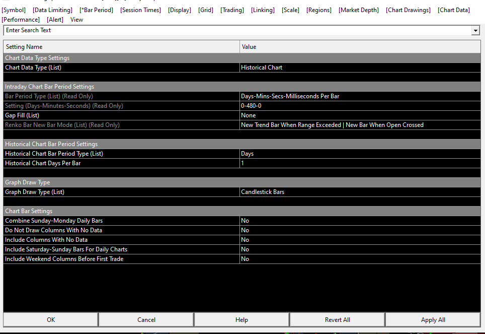 MCL is a new contract. There will not be much historical data available for it. Less than six months. So reduce the number of days loaded in the chart to just three or four months at this time. Use the Days to Load setting. Set that to 90.