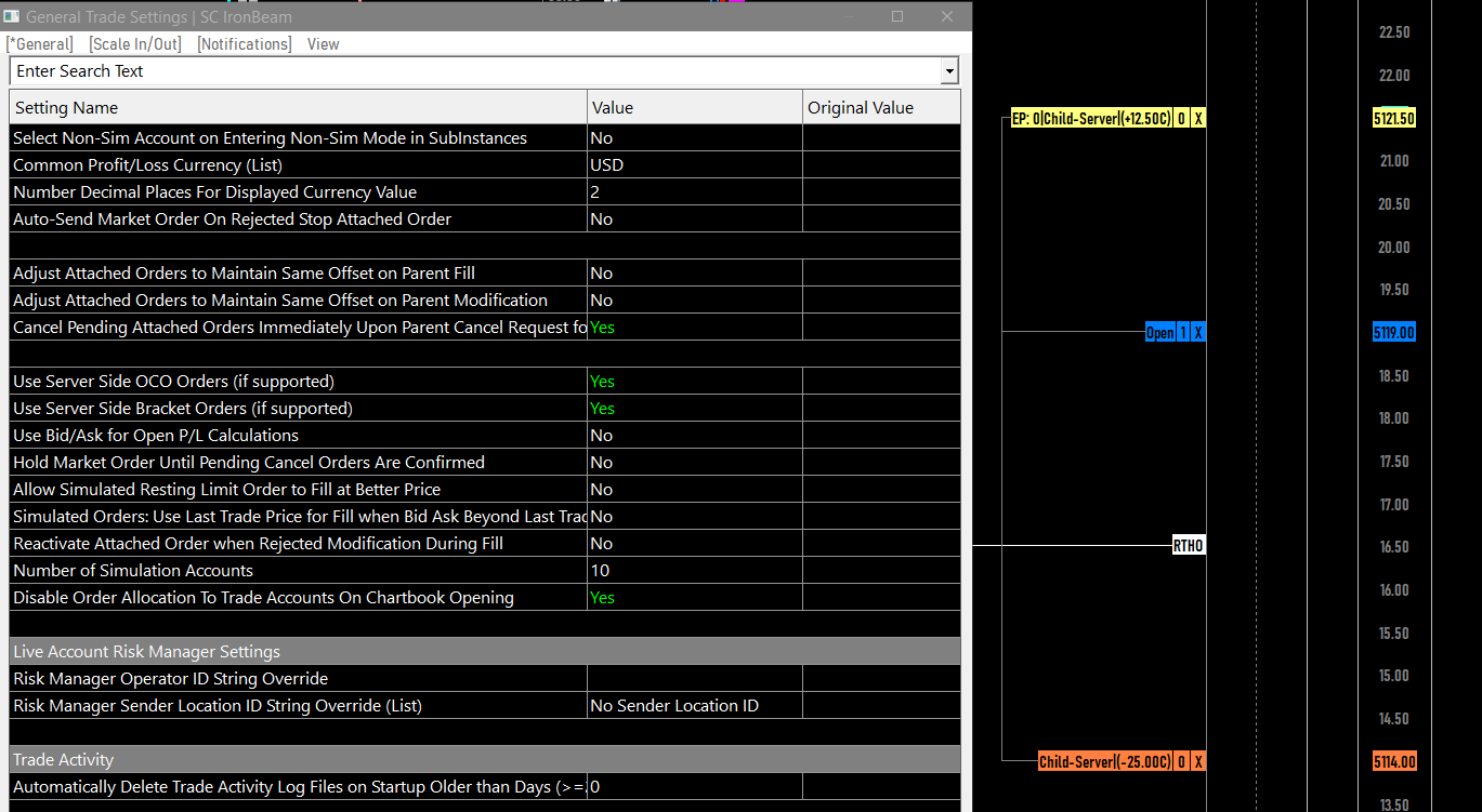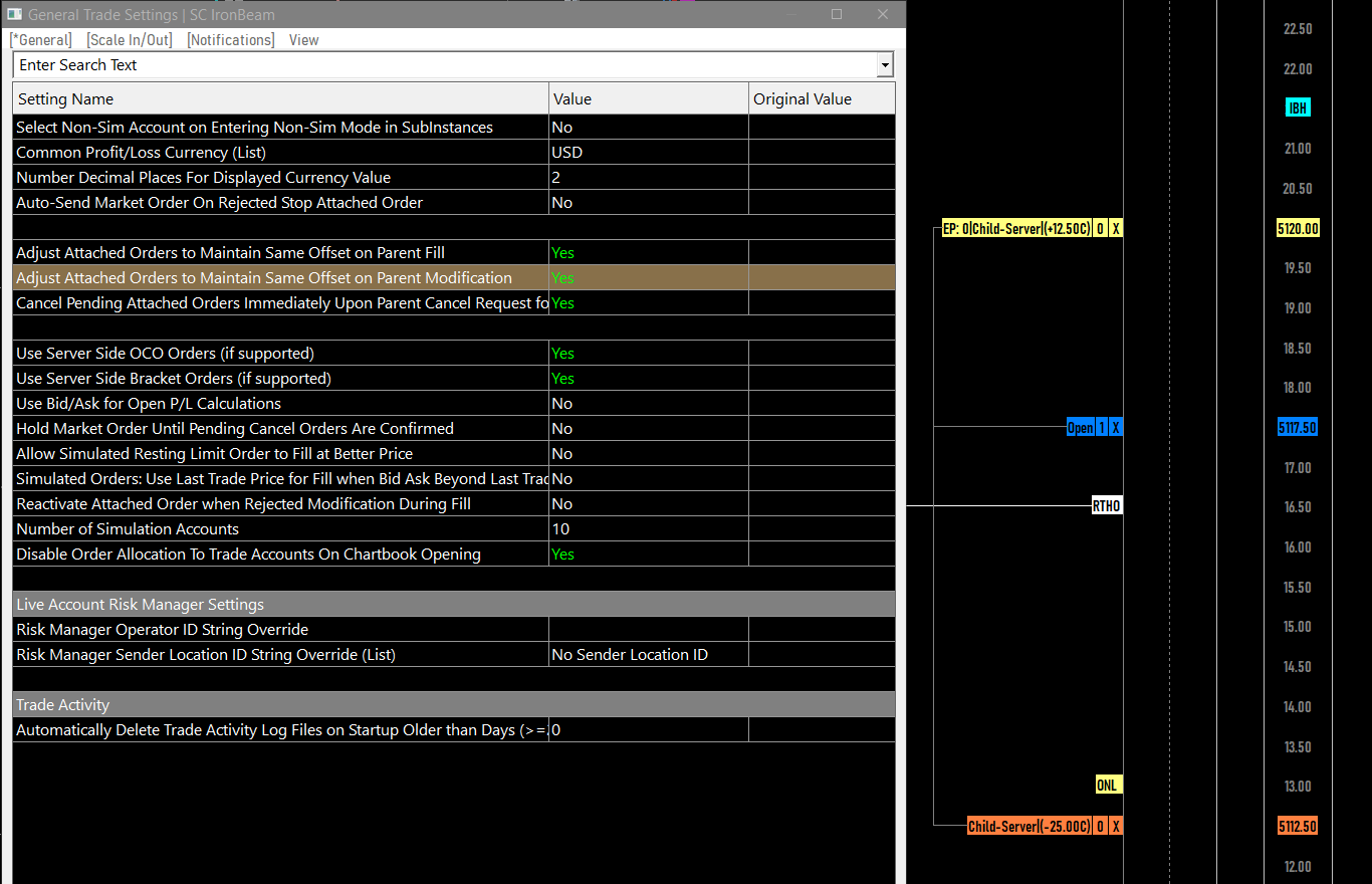 We are not able to reproduce this on version 2609. With the option for "Adjust Attached Orders to Maintain Same Offset on Parent Modification" set to "No", when we modify an parent working order, the attached orders stay in their original position. Can you please give us two screenshots showing what you are seeing, one from before the modification and a second after the modification? For the most reliable, advanced, and zero cost futures order routing, use the Teton service: Sierra Chart Teton Futures Order Routing |
