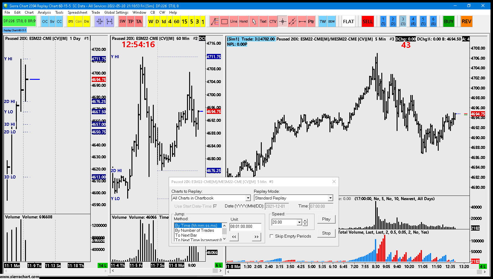 With regards to the replay, there must be some reason it is selecting that date related to your charts. Please attach the chartbook to this thread for us to take a look. Refer to the following for how to attach a file: Support Board Posting Information: Attaching a File (Optional) As to the data, the reason you are seeing the discrepancy in the price is because you are not using a back-adjusted continuous chart. So what are seeing is the actual prices for the individual contracts and where the price jump occurs is the transition from one contract to another. Refer to the following for more information, including information on back-adjusted continuous contract charts: Continuous Futures Contract Charts For the most reliable, advanced, and zero cost futures order routing, use the Teton service: Sierra Chart Teton Futures Order Routing Date Time Of Last Edit: 2022-05-23 14:10:59