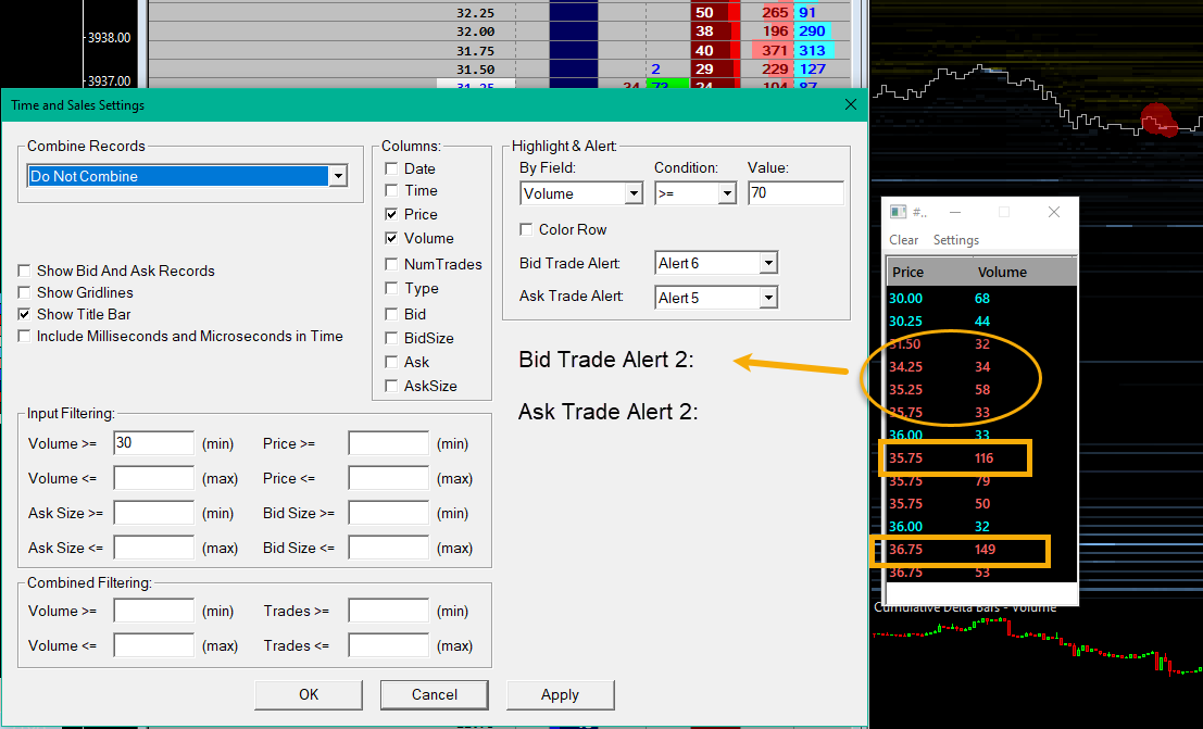 I enjoy using the audio alerts on Time and Sales. Helped me inform of a large volume bid trade and ask trade. I like to have a 2nd set of alerts -- this can alert me of a "medium volume" bid trade. eg. Large volume 100 but medium volume could be 50 or 70 Possible to add this feature into your T&S ? |